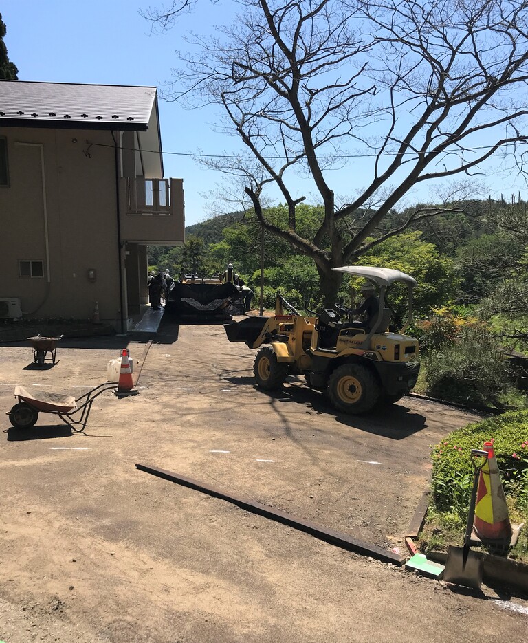 とは言え、舗装の仕上がりはさすがプロのお仕事。丸三日、延べ30人以上の作業員の皆さんに携わっていただきましたが、仕事の段取りと流れるような連携作業が素晴らしい。まず、これまでの庭の土を削って下地の基礎を作る作業でしょ。次に、砕石や砂利を投入しての下地作り。そしてアスファルト投入。使う重機の威力もすごいが、職人の技もすごいなぁ。特にアスファルト投入時は時間との闘いという感じ。アスファルトをダンプからローダーで運び専用重機に投入。重機で地面に張り付けたあと、すかさずローラーでならす。凸凹はガスバーナーで熱して小さいローラーで補正。作業の役割分担がきちっとしていて一寸の無駄もない。勉強させていただきました!(笑)
