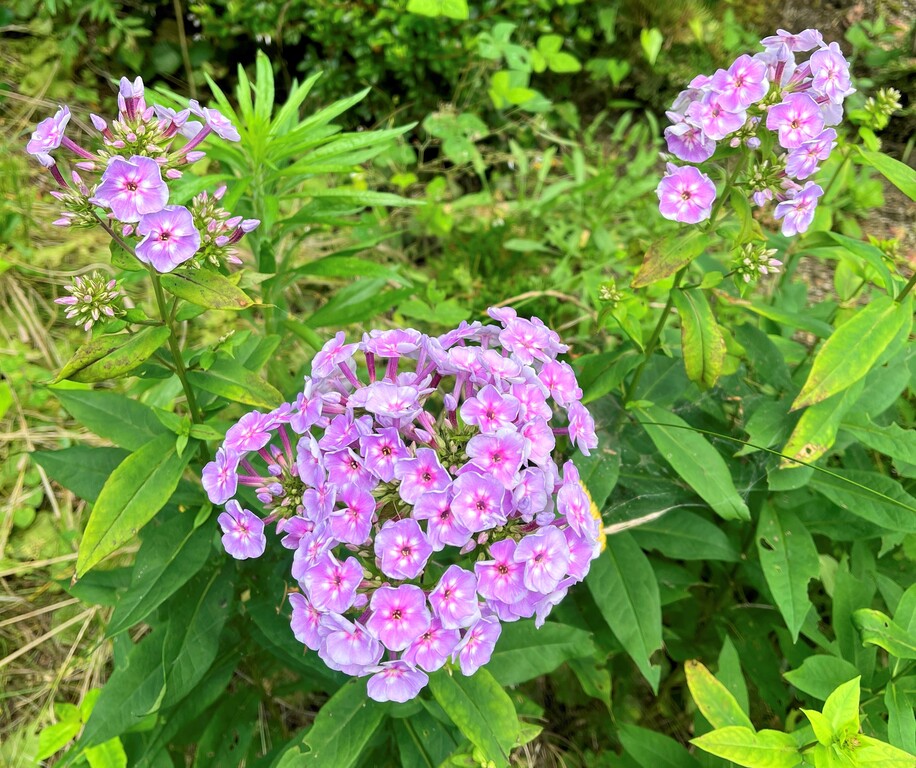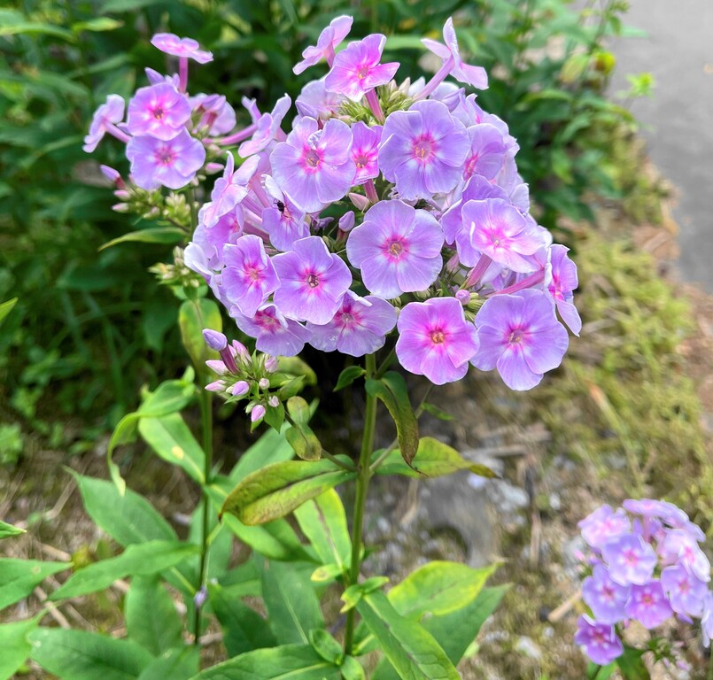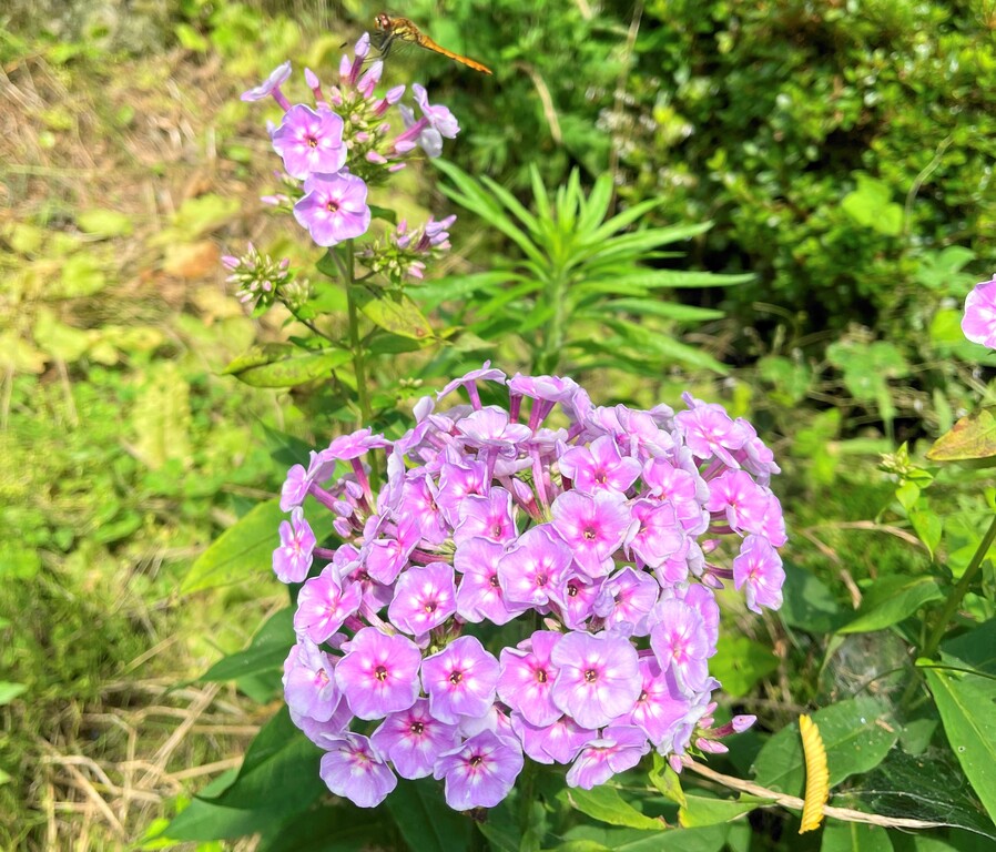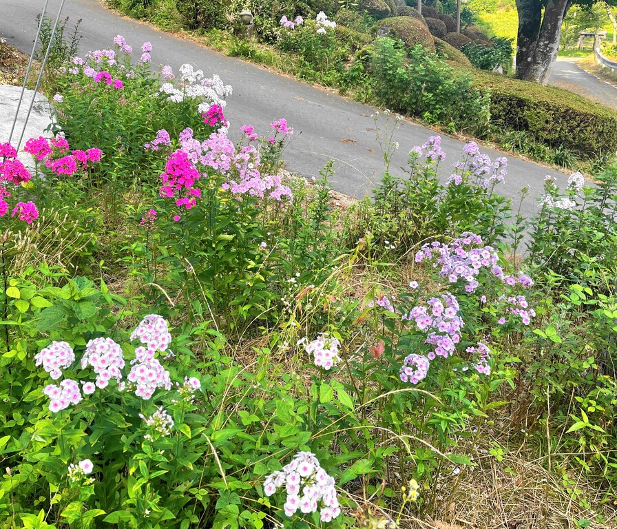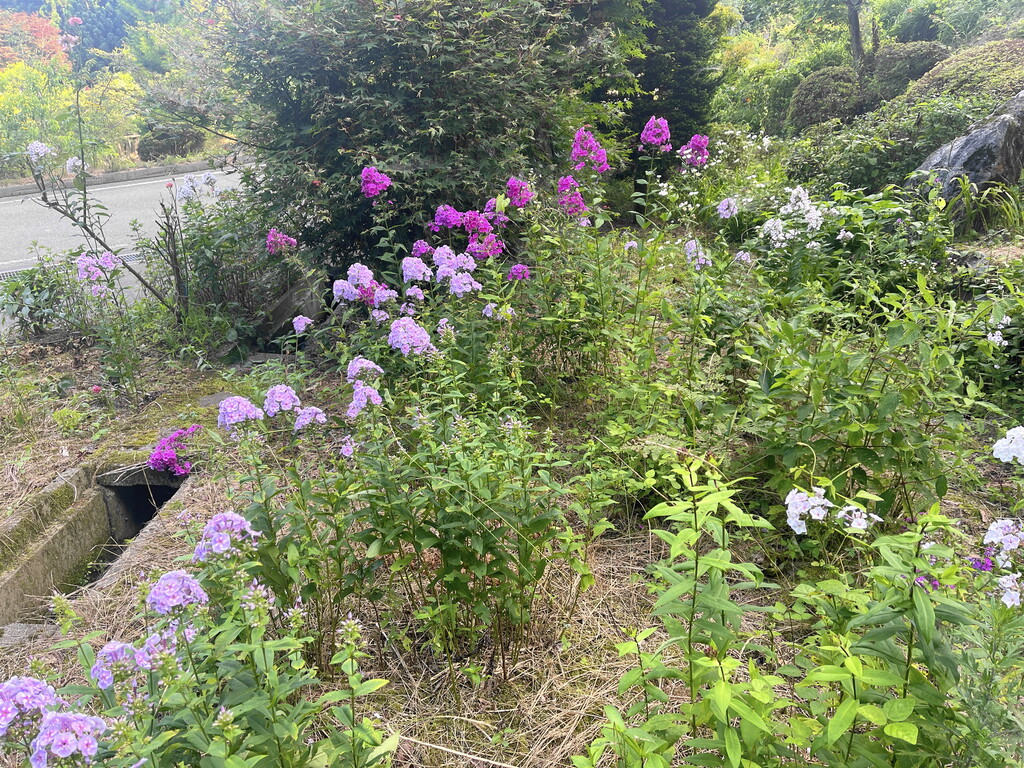昨年までの花畑は、スーパー爺ちゃんが別なものを植えるのに耕してしまったので、その数はぐっと少なくなりました。それでも敷地内で今一番めだっているのが「オイランソウ(花魁草)」。別名で「クサキョウチクトウ」とかともよばれていますが、正式名称は「宿根(しゅくこん)フロックス」というらしいです。