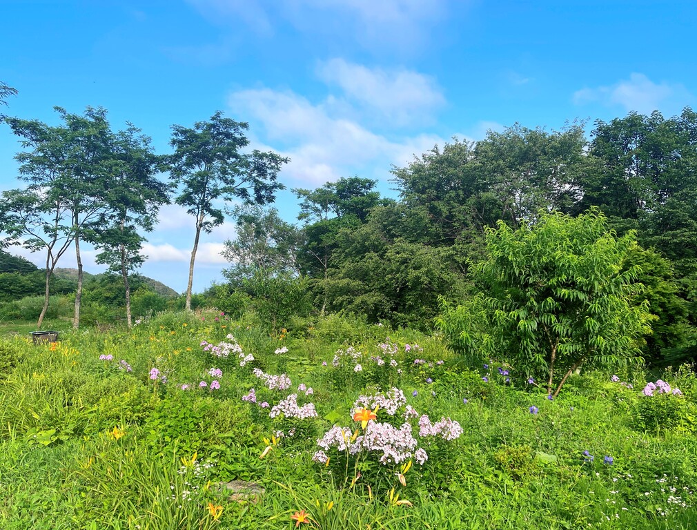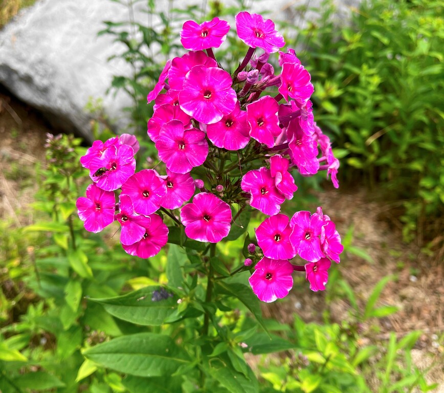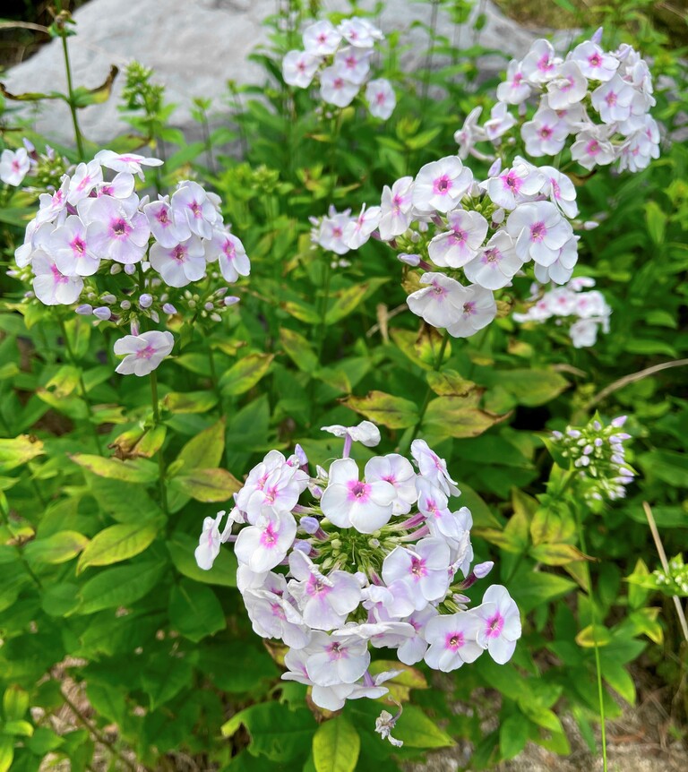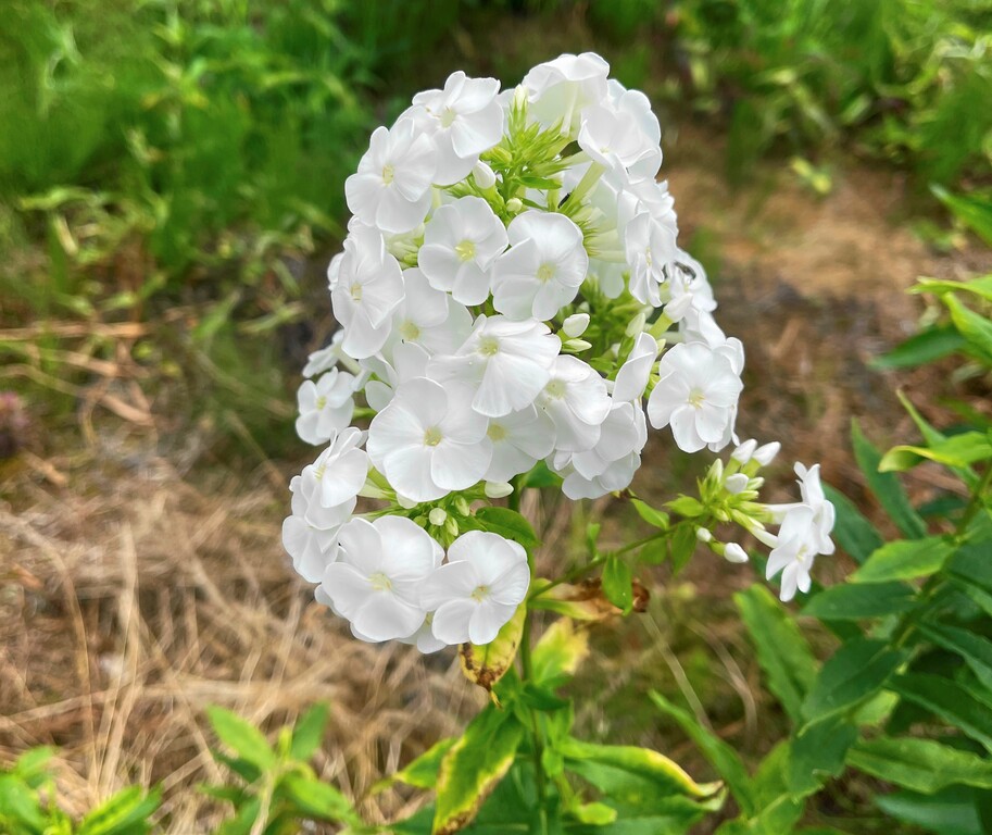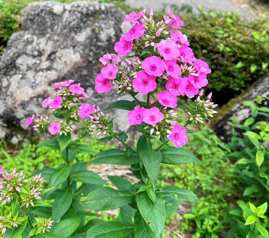 昨年までの花畑は、スーパー爺ちゃんが別なものを植えるのに耕してしまったので、その数はぐっと少なくなりました。それでも敷地内で今一番めだっているのが「オイランソウ(花魁草)」。別名で「クサキョウチクトウ」とかともよばれていますが、正式名称は「宿根(しゅくこん)フロックス」というらしいです。