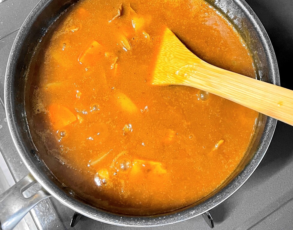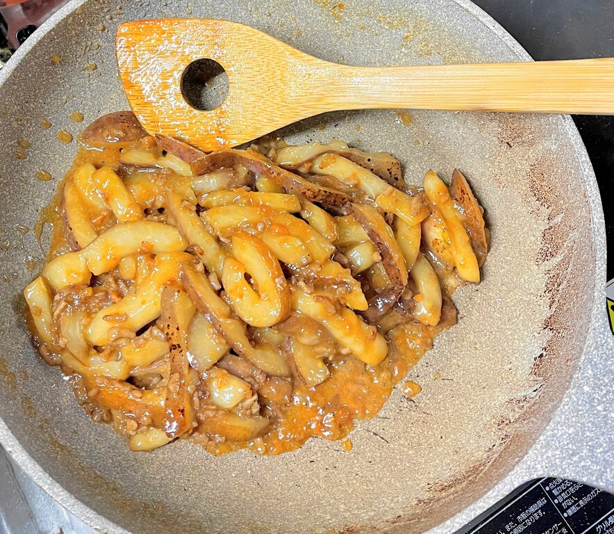 最後に、ミリンで溶いた味噌を加えて、さっと炒め合わせたら完成です。