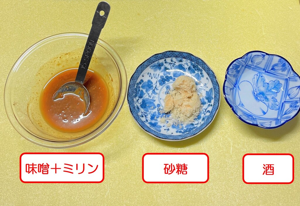 味噌、ミリン、砂糖、酒。分量の比率は、超簡単の「1:1:1:1」(笑) 味噌とミリンはあらかじめ混ぜ混ぜしておきます。