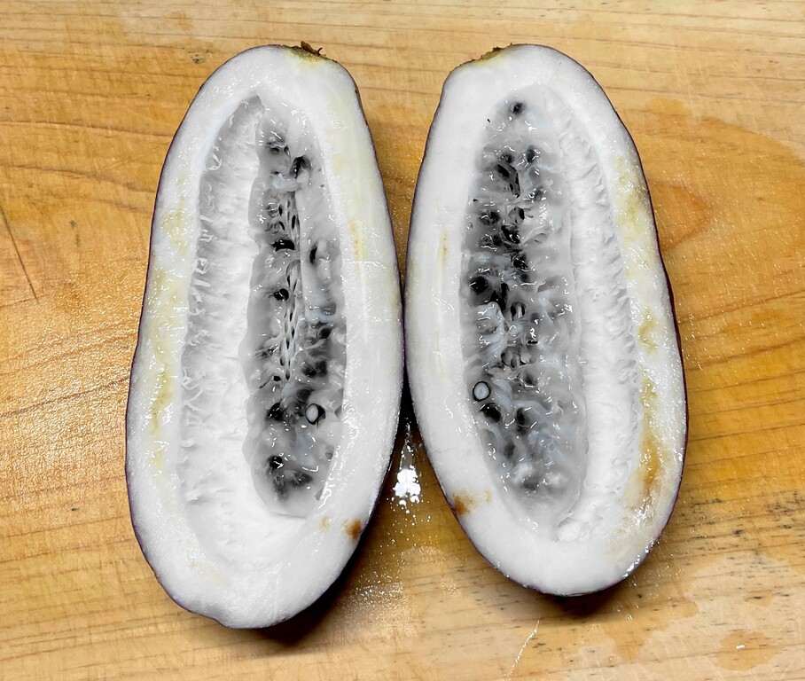 皮を割ると黒い種子がたくさん入っている白いものが出てきます。この種を包んでいる白い部分がとても甘い。ただし、種はとても堅いので飲みこまないようにしながら、白い部分だけを口の中で溶かして味わい、口に残った種は「プッ!!」っと吐き出するというのが一般的な食べ方ですね。