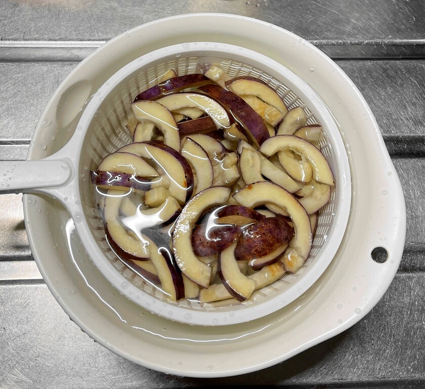 実を取り出して残った皮は、急いで食べやすい大きさにスライスして、水に浸しておくことをおすすめします。そのままにしておくと、すぐに茶色に変色してしまうので。