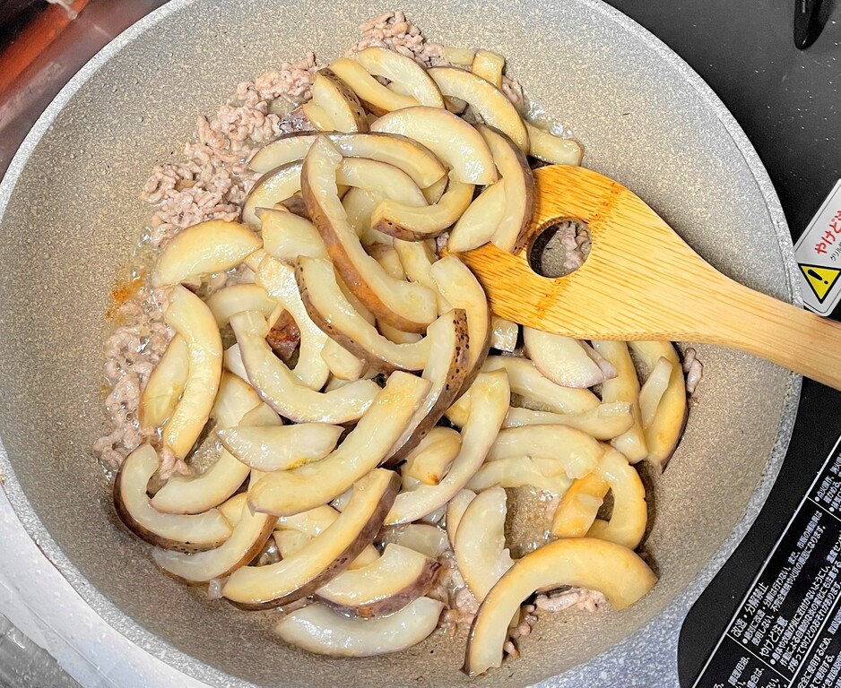 フライパンにサラダ油を熱し、豚挽き肉を炒めます。ひき肉に火が通ったら、しっかり水気を切ったアケビの皮を投入し良く炒めます。