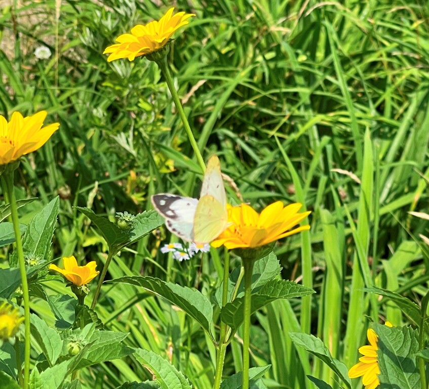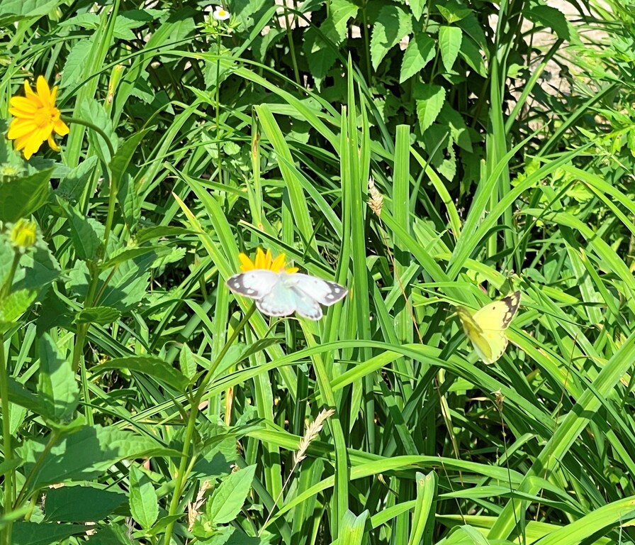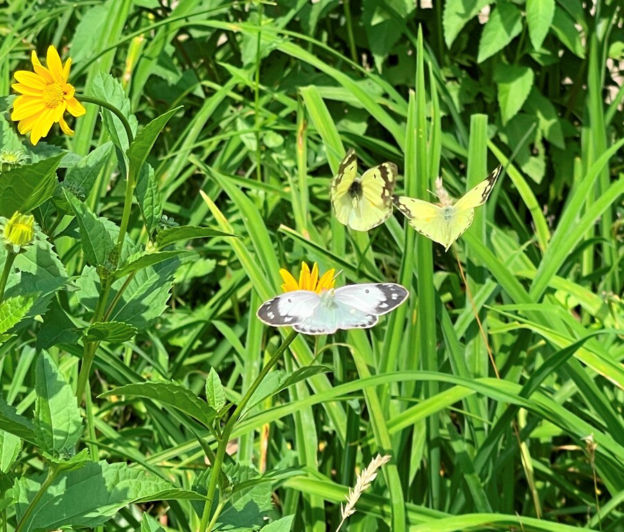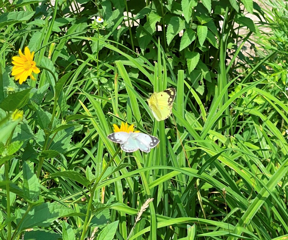 花は他にもたくさんあるのに、モンシロチョウが止まっている花にモンキチョウが・・・