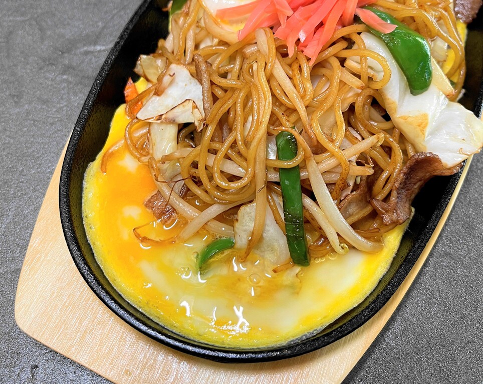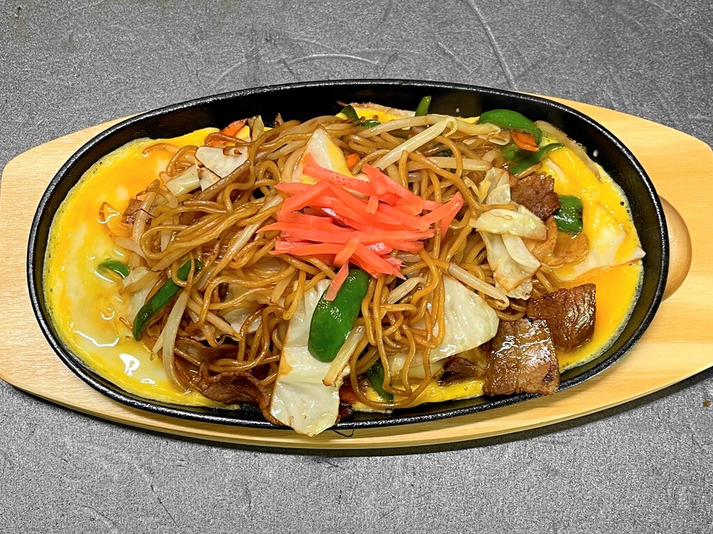 ジュージューといい音を立てている焼きそばの周りに、溶き卵を回し入れてみました。最後に紅ショウガを載せて完成で~す。