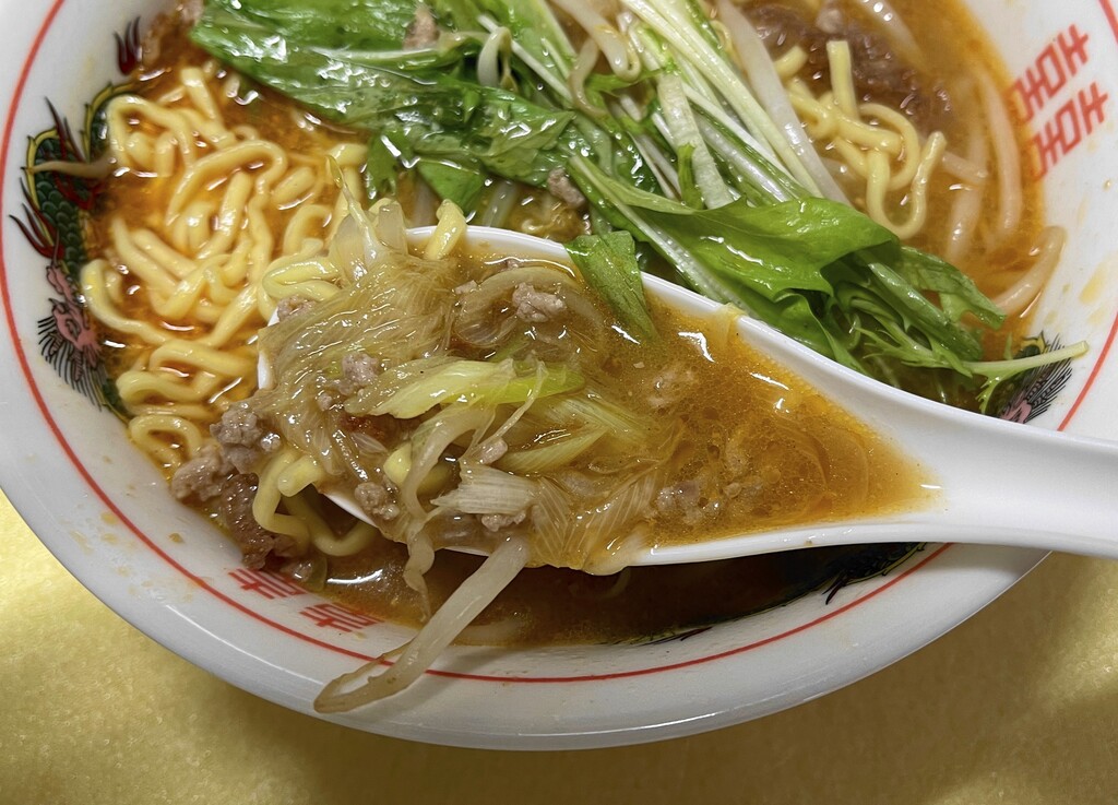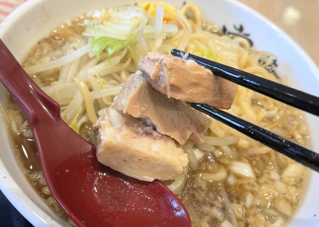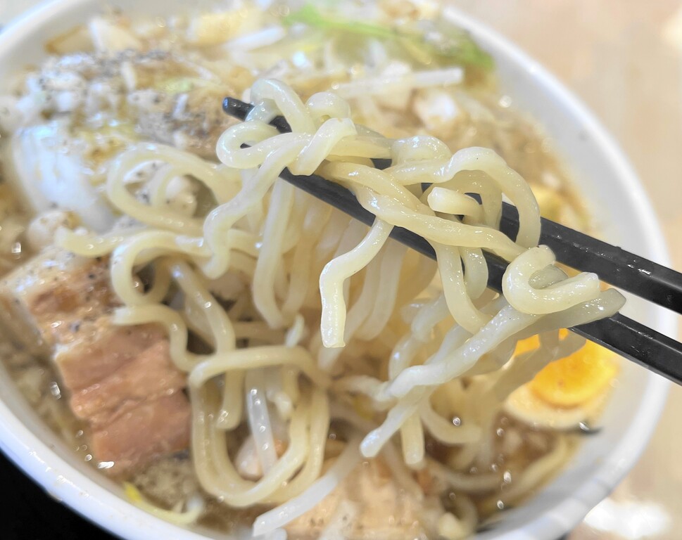 麺は普通の太麺でした。「二郎系」と謳っているので「玉うどん」のような超極太麺が出てくるのかなとちょっと期待していたので残念(笑) そしてスープもなんか大雑把というか、味にパンチがありません(笑)