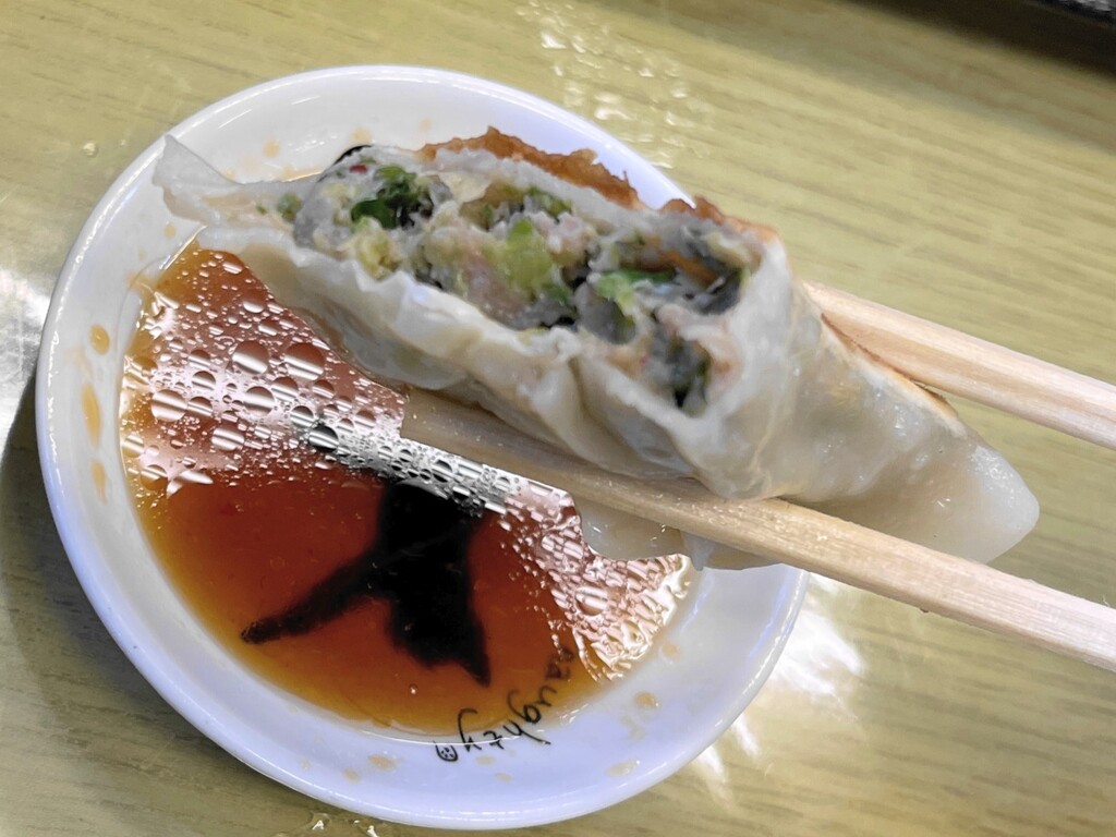 最初は「3個で400円って、高くね?」と思っていたのですが、この餃子もかなりの大きさでした。1個で、普通の店なら2個分くらいありそうです。