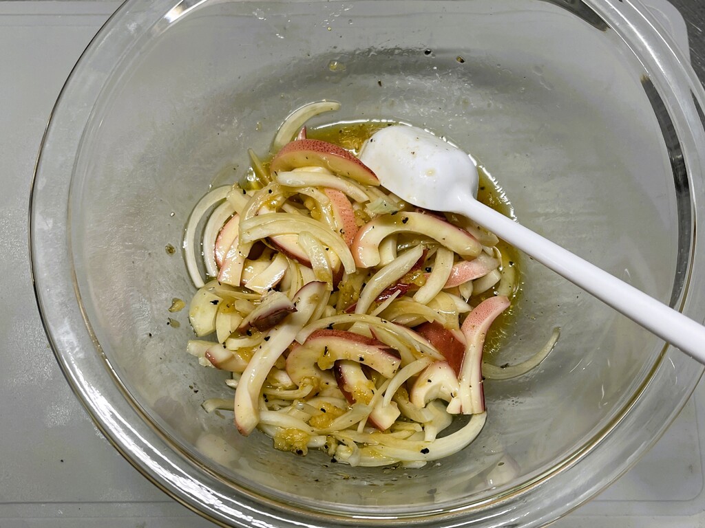 このまま揚げてもいいのですが、「ユリ根」だけだと飽きちゃうと思うので、タマネギとニンジンもいれてみます。