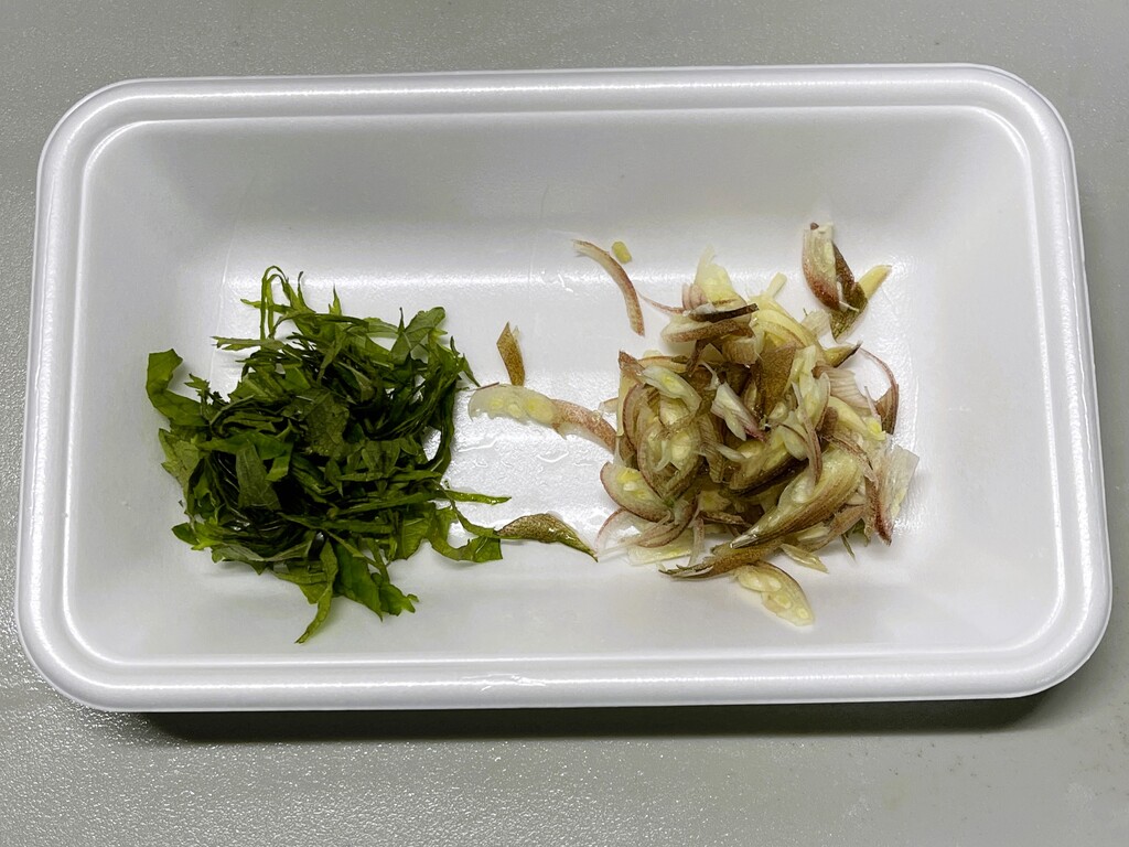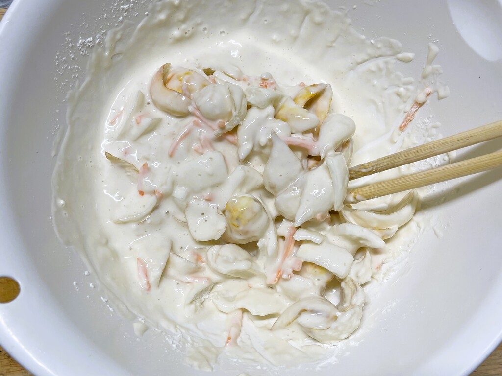 それを水と小麦粉と片栗粉を混ぜたボールに投入して、かき混ぜたらあとはカラッと揚げるだけ。