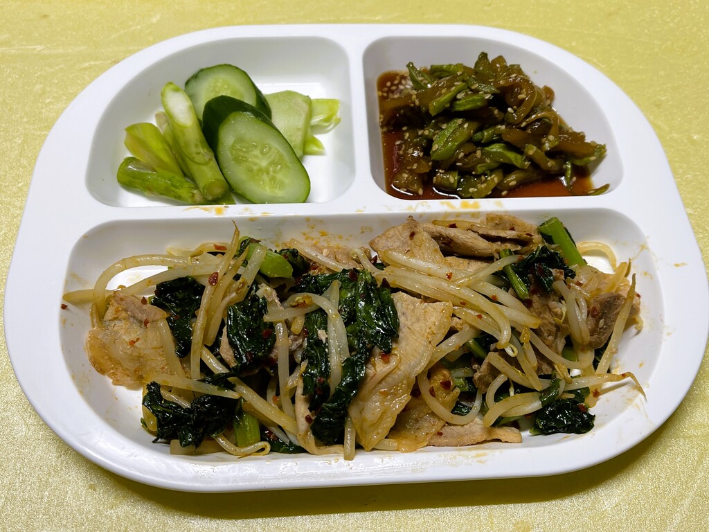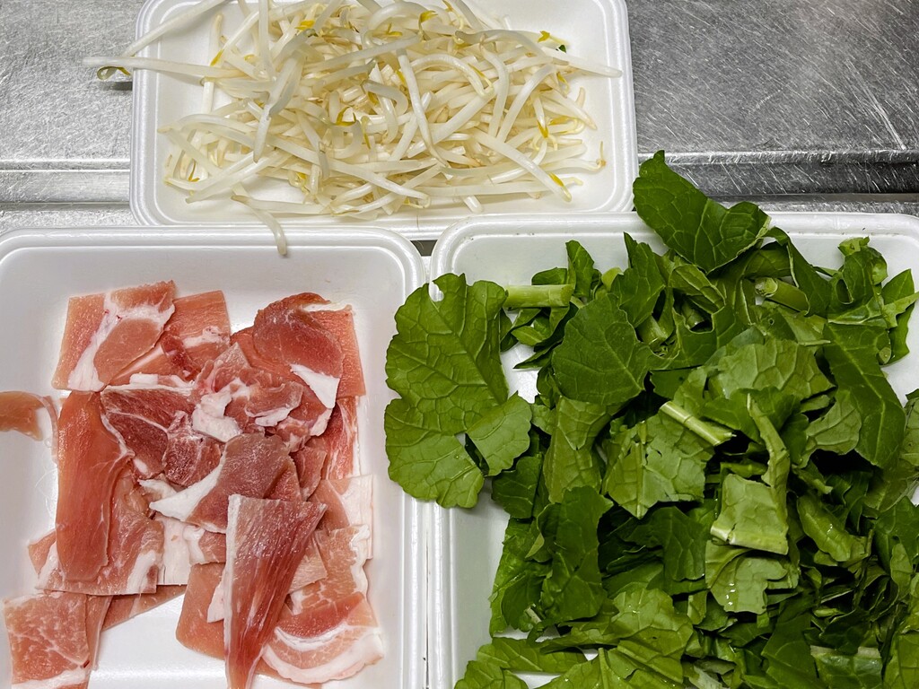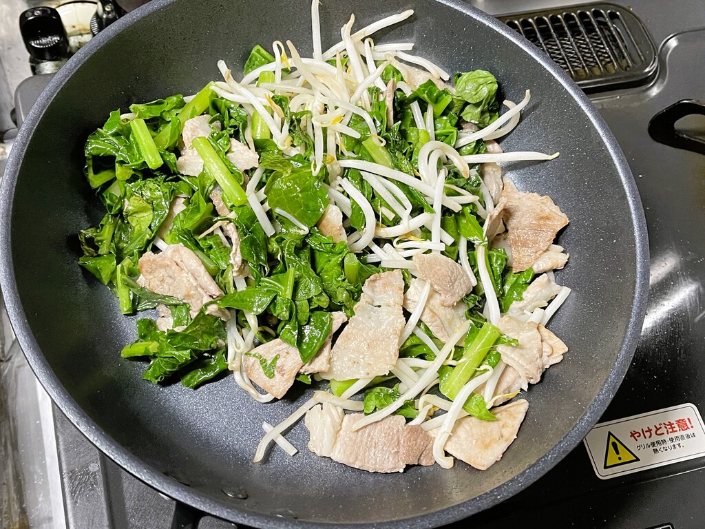 次は、スーパー爺ちゃんの畑で採り放題になっている大根の葉の炒め物です。少し残っていたモヤシも使い切ってしまいましょう。