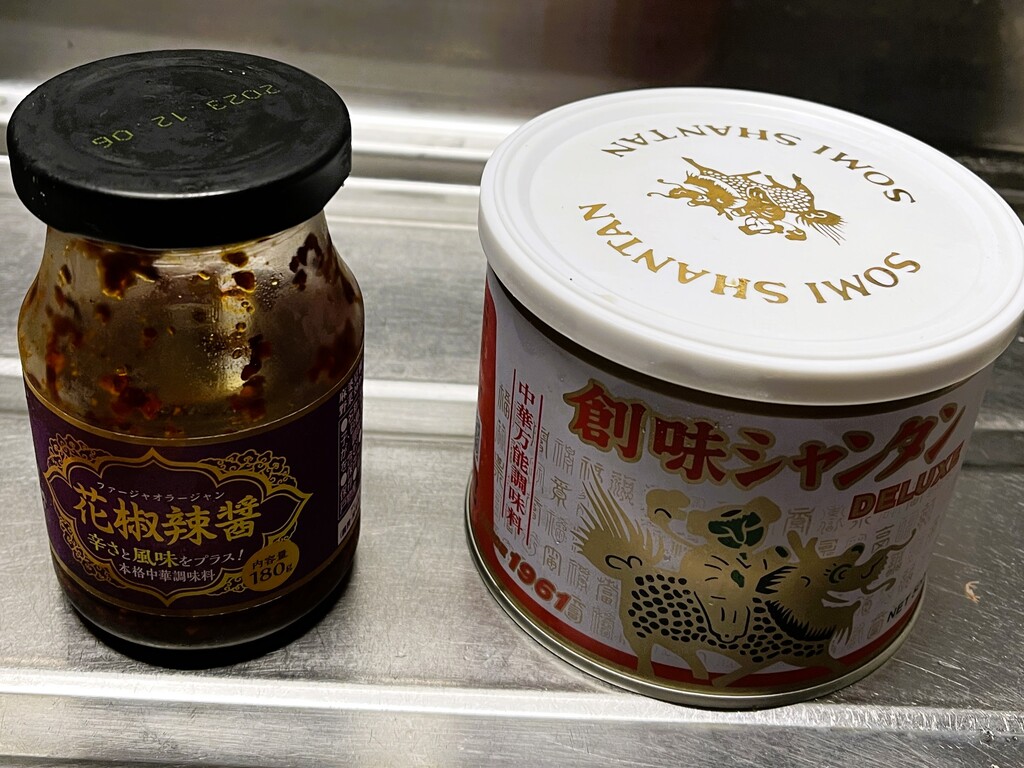 味付けはいつもの「創味シャンタン」と、今回はピリ辛にしたいので業務スーパーで購入している「花椒辣醤(ファージャオラージャン)」を使います。