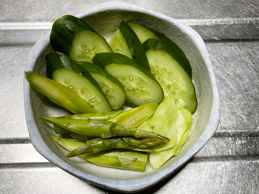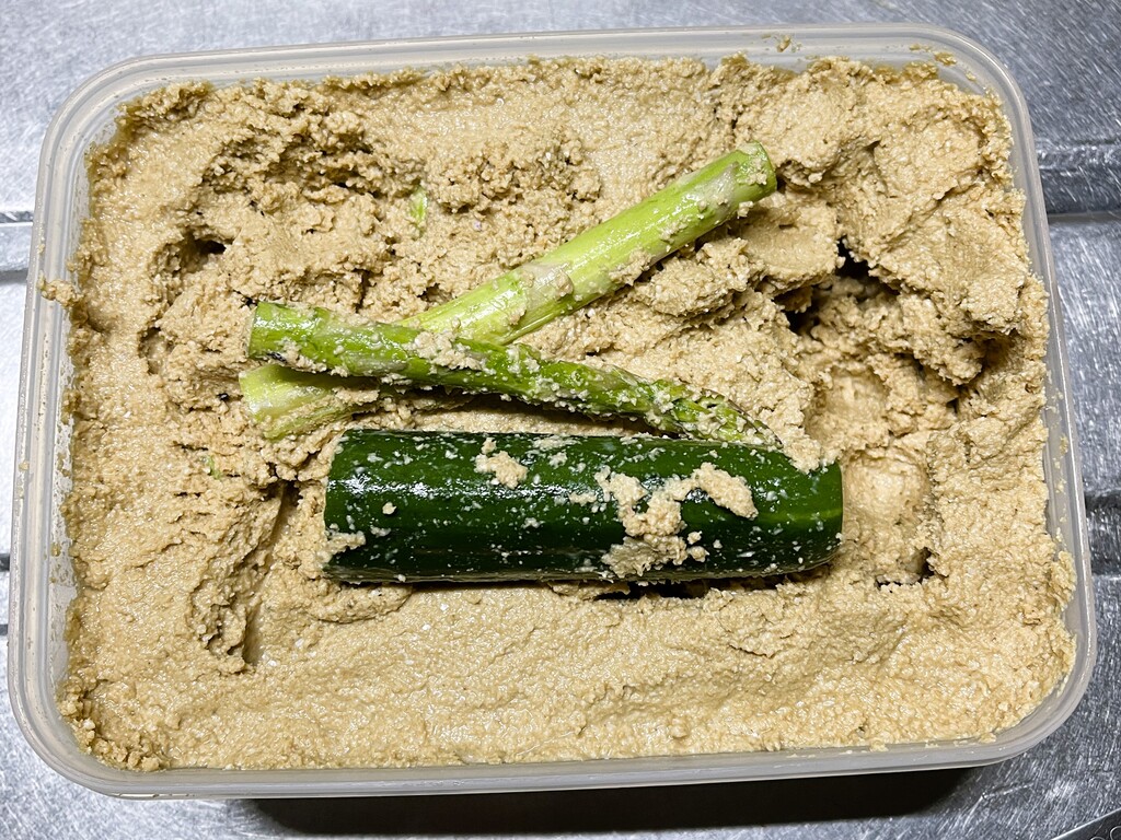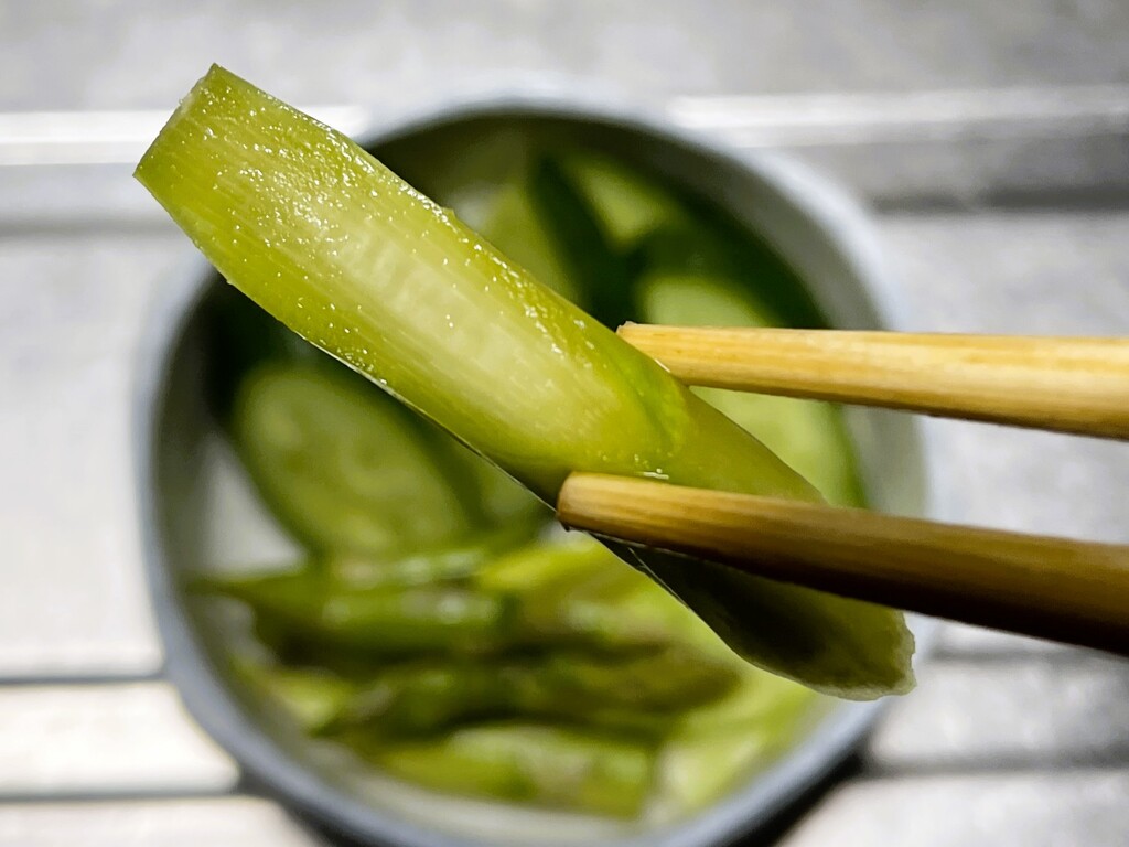 うっ!! 味は不味くはない。でも、皮の繊維が残ります🤣 もっとよく皮を剥けばよかったのかな。いずれにしてもアスパラガスは、ぬか漬けには向いていないことが判明しました(笑)