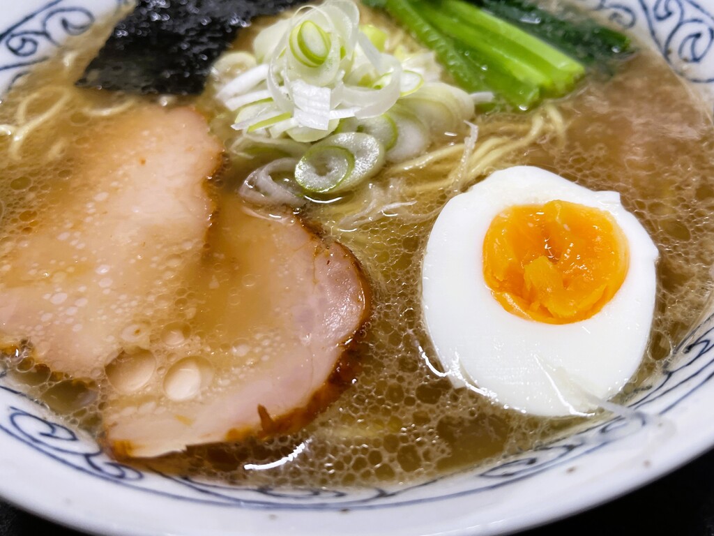 トッピングは冷蔵庫にあったもので「小松菜、煮卵、チャーシュー、ネギ、海苔」にしてみました。
