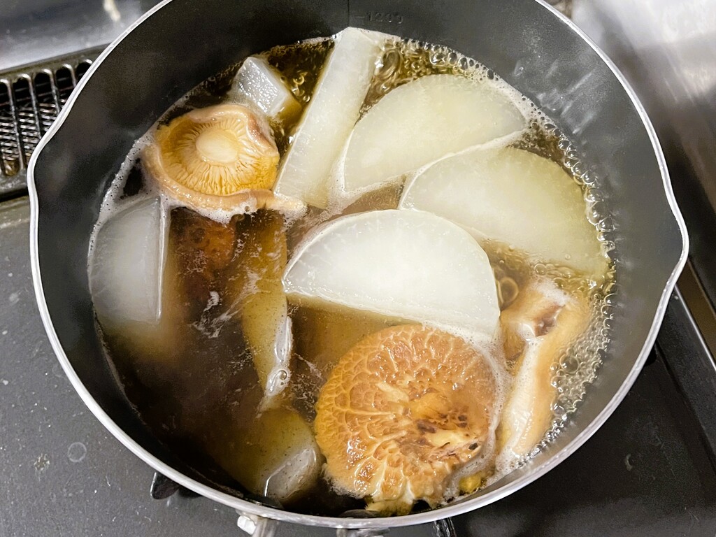 和風だしの素、醤油、みりん、酒、塩で味付けをして、コトコトしばらく煮込んだら完成です。