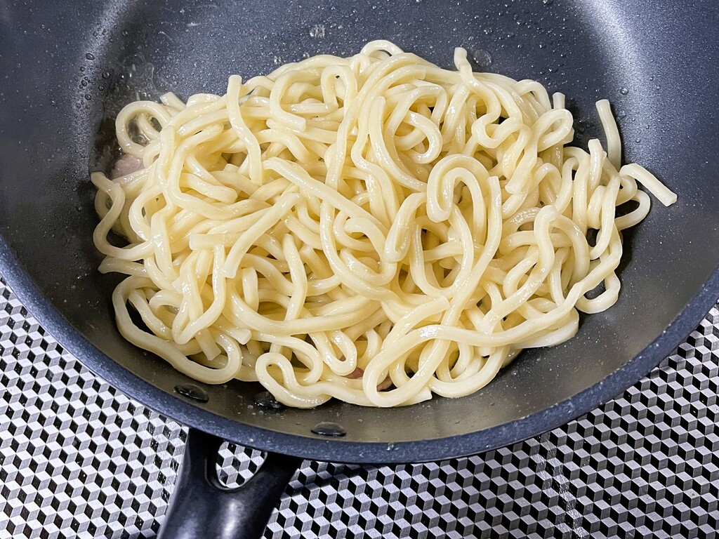 豚肉が炒まったら茹でた麺を投入。
