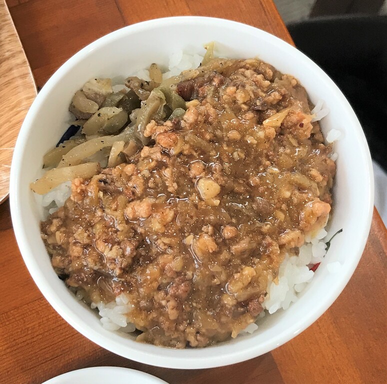 ここでひろちゃんが、麺の器が小さめのため私のお腹が満たされないと思ったのか、人気があるという「滷肉飯(ルーローハン)」の小(280円)を追加注文してくれた。台湾では学校給食でも人気があるという国民的なメニューらしいです。