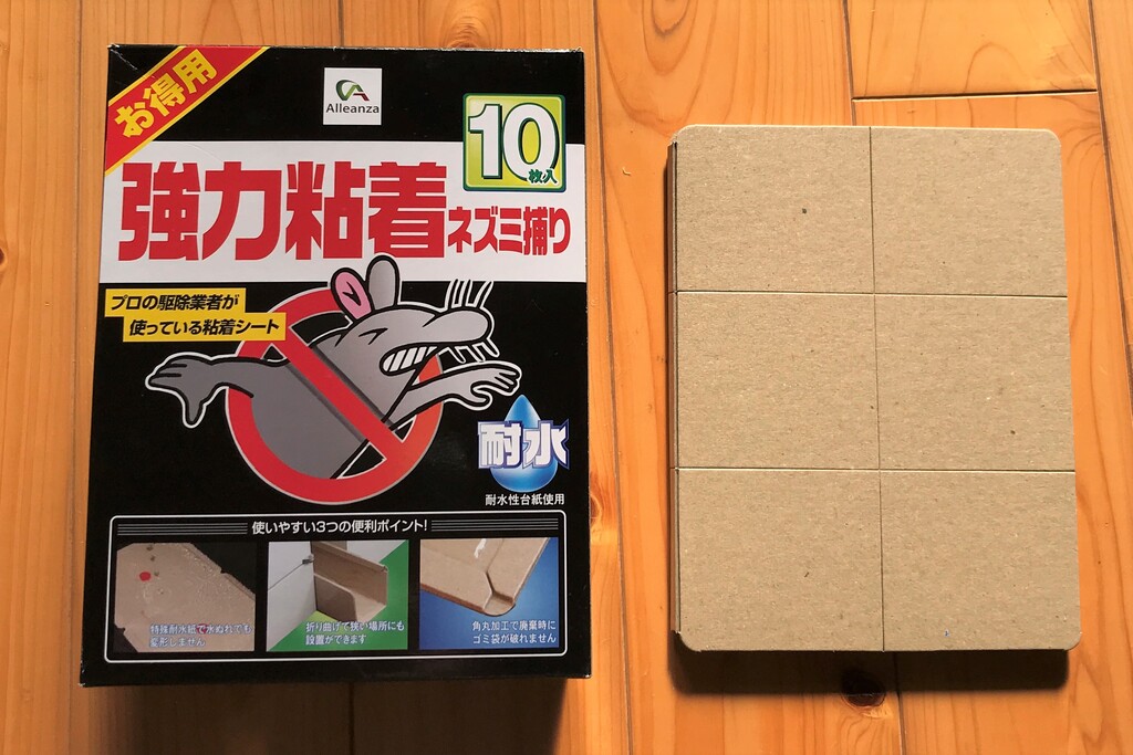 粘着式のネズミ捕りです。ネズミの被害が出ていたので、スーパー爺ちゃんがこれを仕掛けたところ、狙ったネズミは掛からず、そのかわりカマドウマがたくさん粘っていた(笑)
