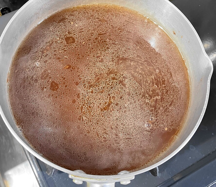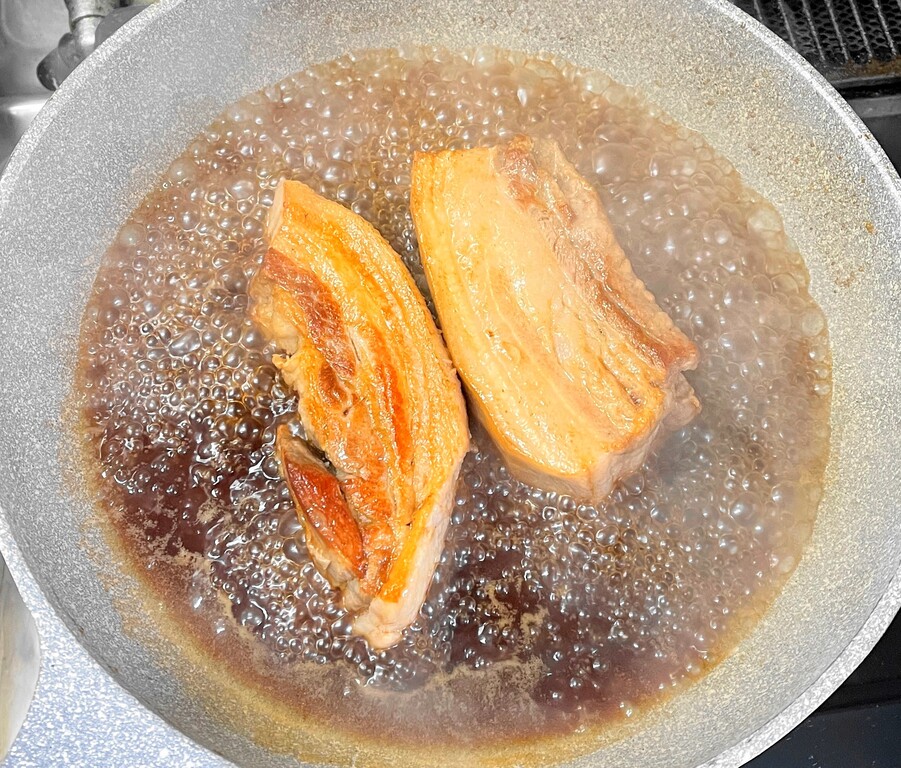 肉が茹で上がったら一旦取り出して、ゆで汁100mlと醤油、ハチミツ、オイスターソースを入れ沸騰させます。その後肉を戻し入れ、汁気が少なくなるまで10分ほど煮絡めて出来上がりです。