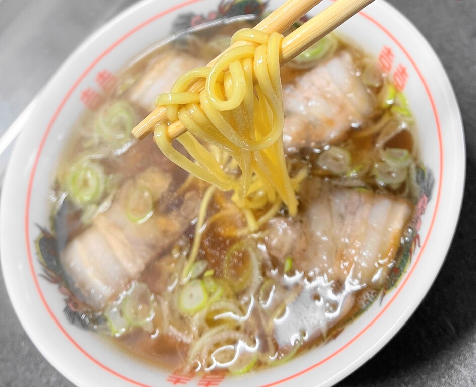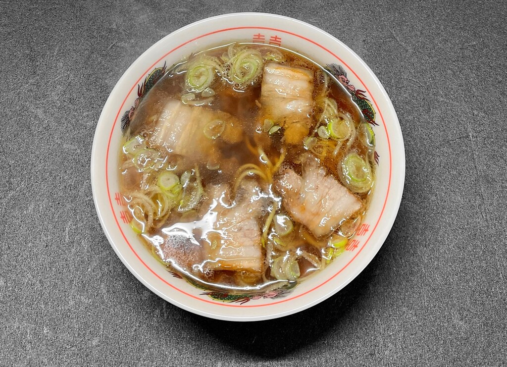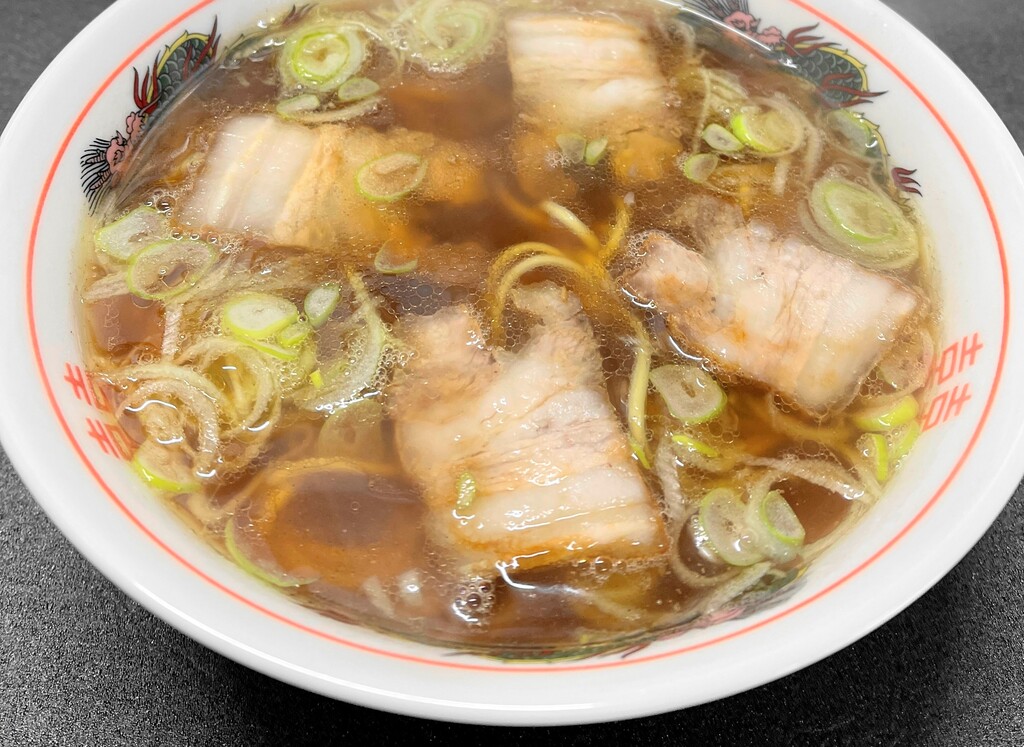 先ほど豚バラブロック肉を茹でたときの“ゆで汁”です。ザルで濾したものに、醤油、塩、味の素、コショウで味付けしてみました。これが信じられないくらい良いお味。私の大好きな「丸信ラーメン」のスープの味に似ているかも。