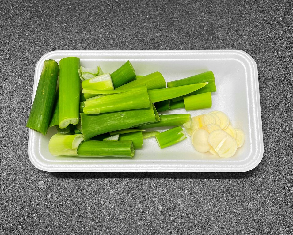 ネギの青い部分が50gとニンニク一片をスライスしたもの。