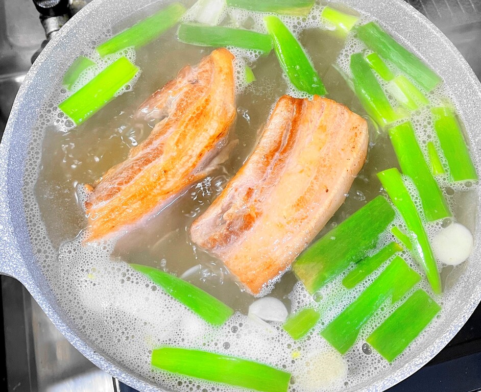 次は水1,000mlと酒、すりおろしショウガを入れて、準備しておいたネギとニンニクを投入。沸騰したら弱火にし、蓋をして30分くらい煮ます。