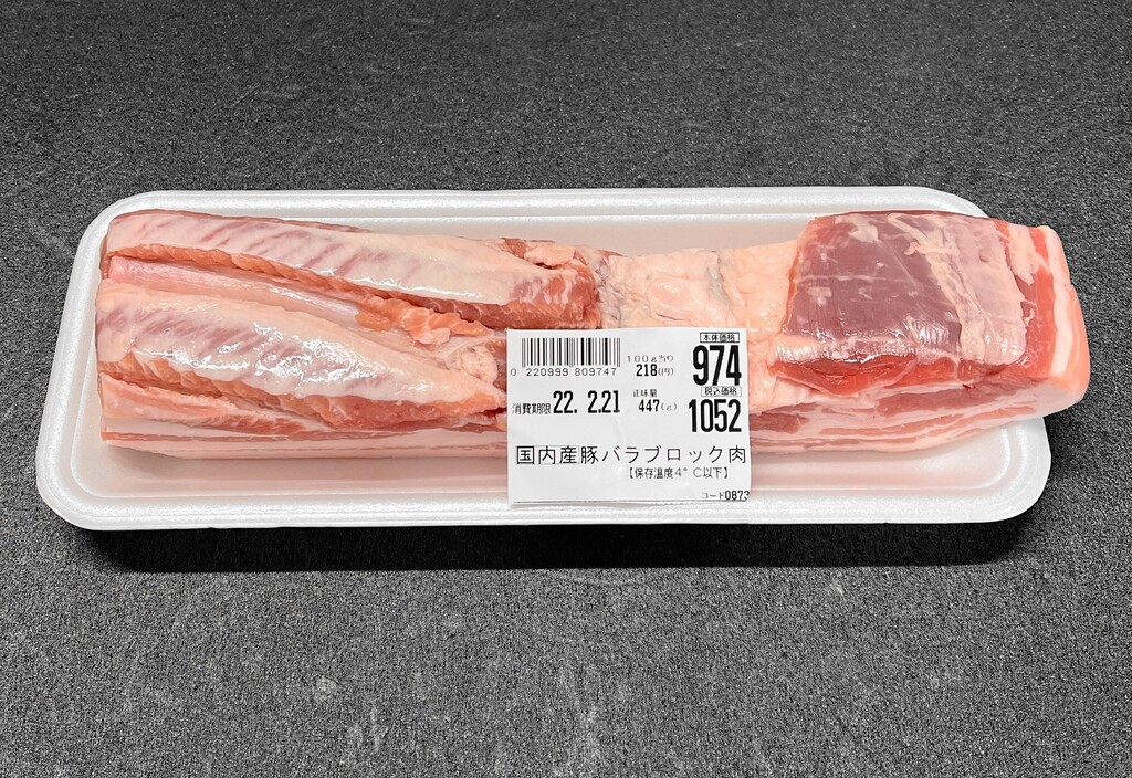 447gで税込1,052円の国産豚バラブロック肉。