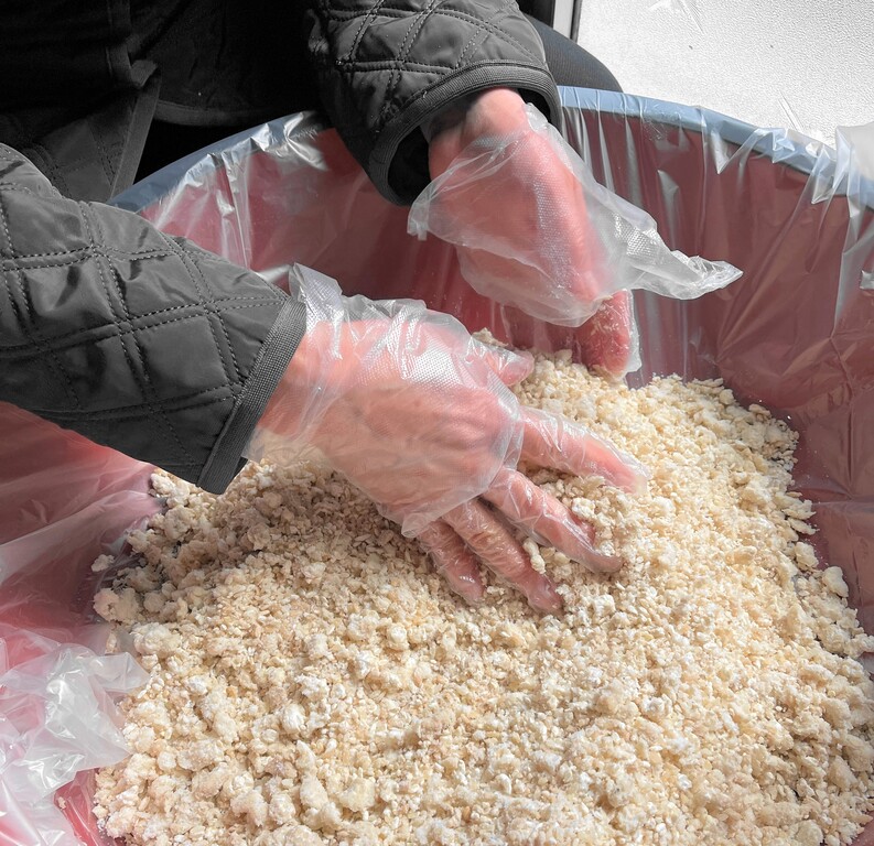 その後、先ほどの「塩きり糀」と良く混ぜ合わせ、大豆の煮汁で調整しながら耳たぶくらいの固さになるように捏ねていきます。