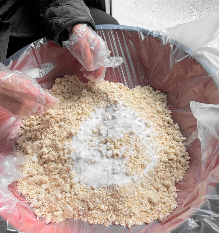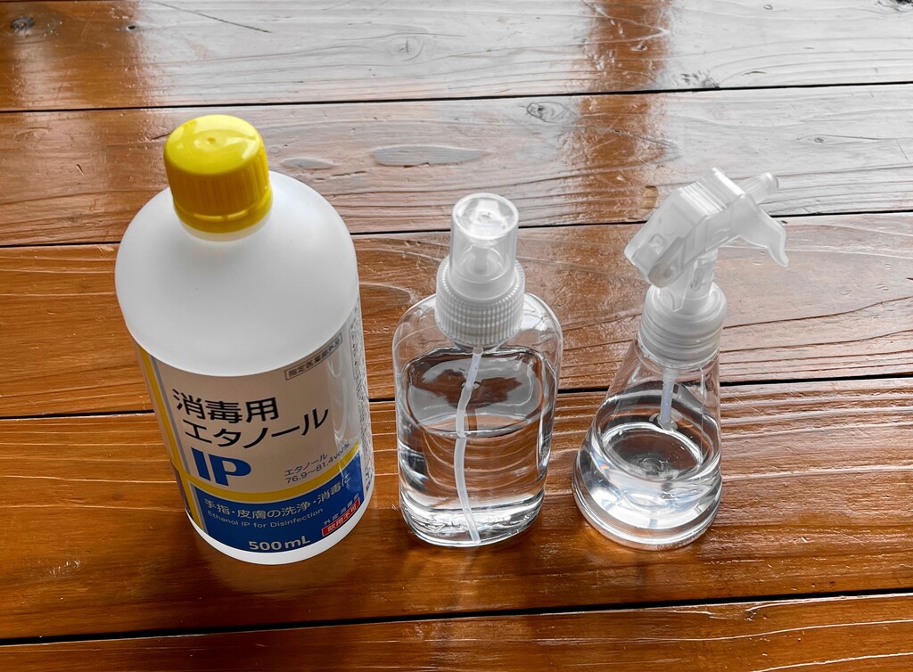 次は保存用に使う袋と樽に、アルコールをたっぷり噴霧して消毒します。