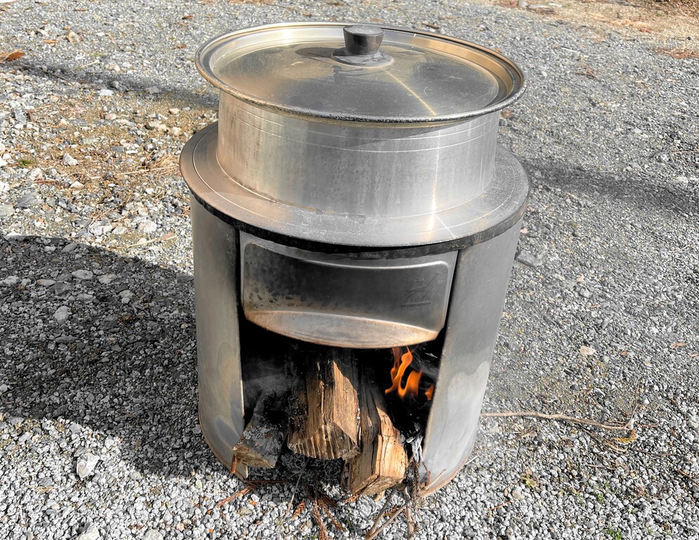 さすがスーパー爺ちゃんですね、準備してくれた「羽釜」は「簡易かまど」にピッタリと収まる代物でありました。