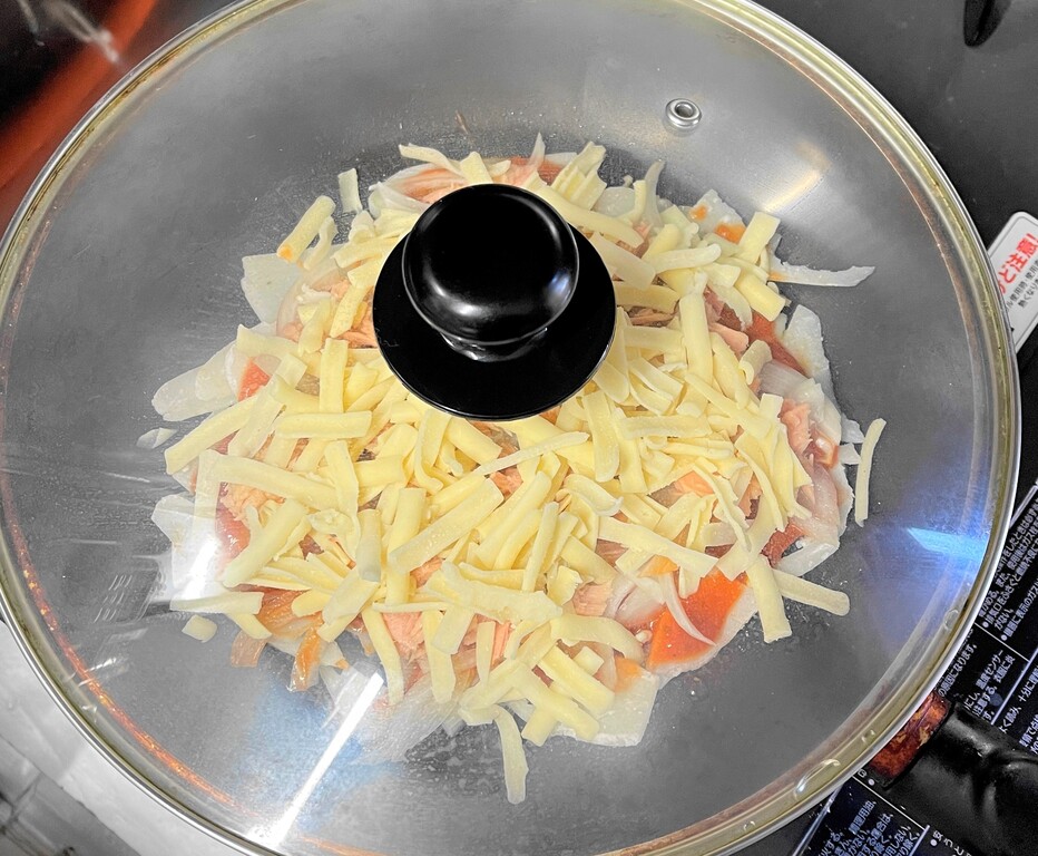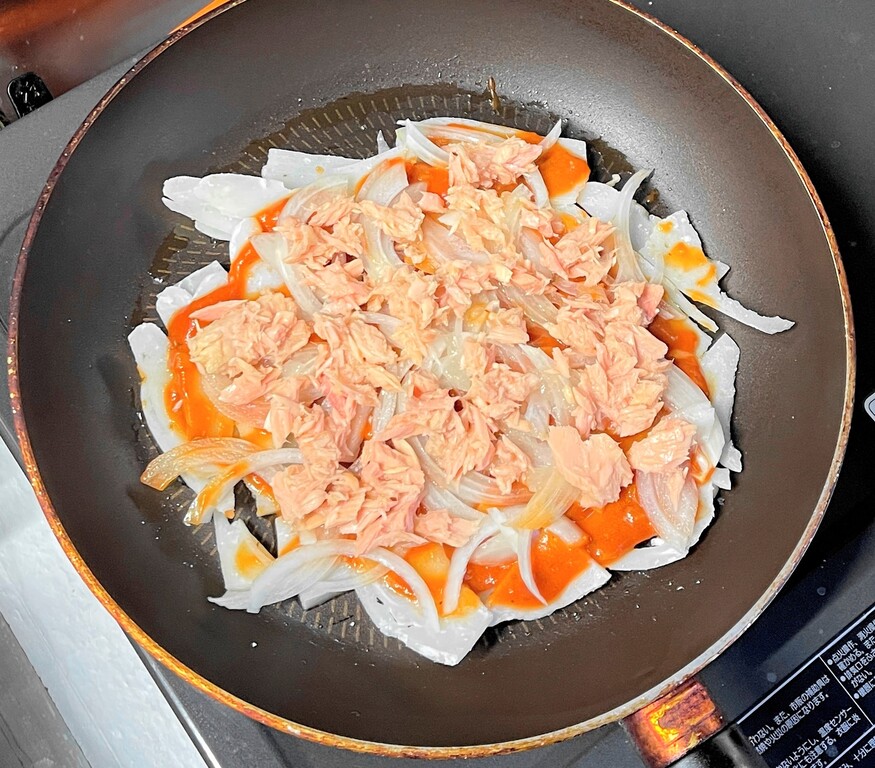 まずはタマネギのスライスを敷いて、ベーコン・・・は在庫がありません。ウインナーもありません。ピーマンもありません。トマトもありませ~ん(笑) でも、私にはコレがある!!