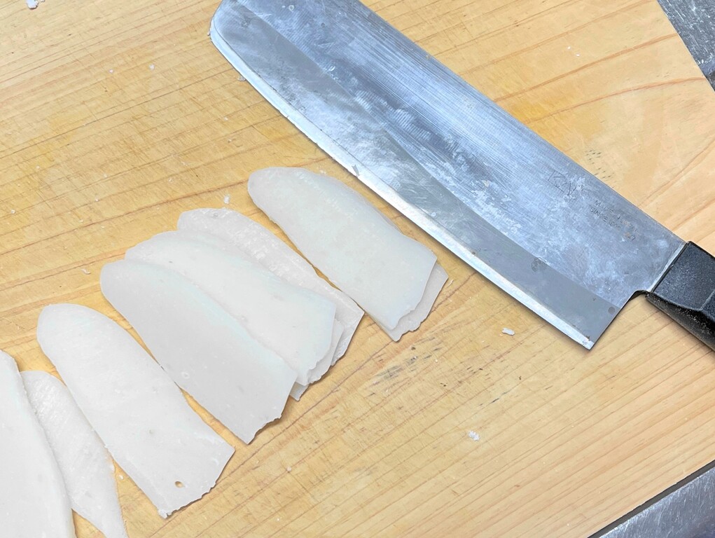 まずは餅を薄くスライスします。