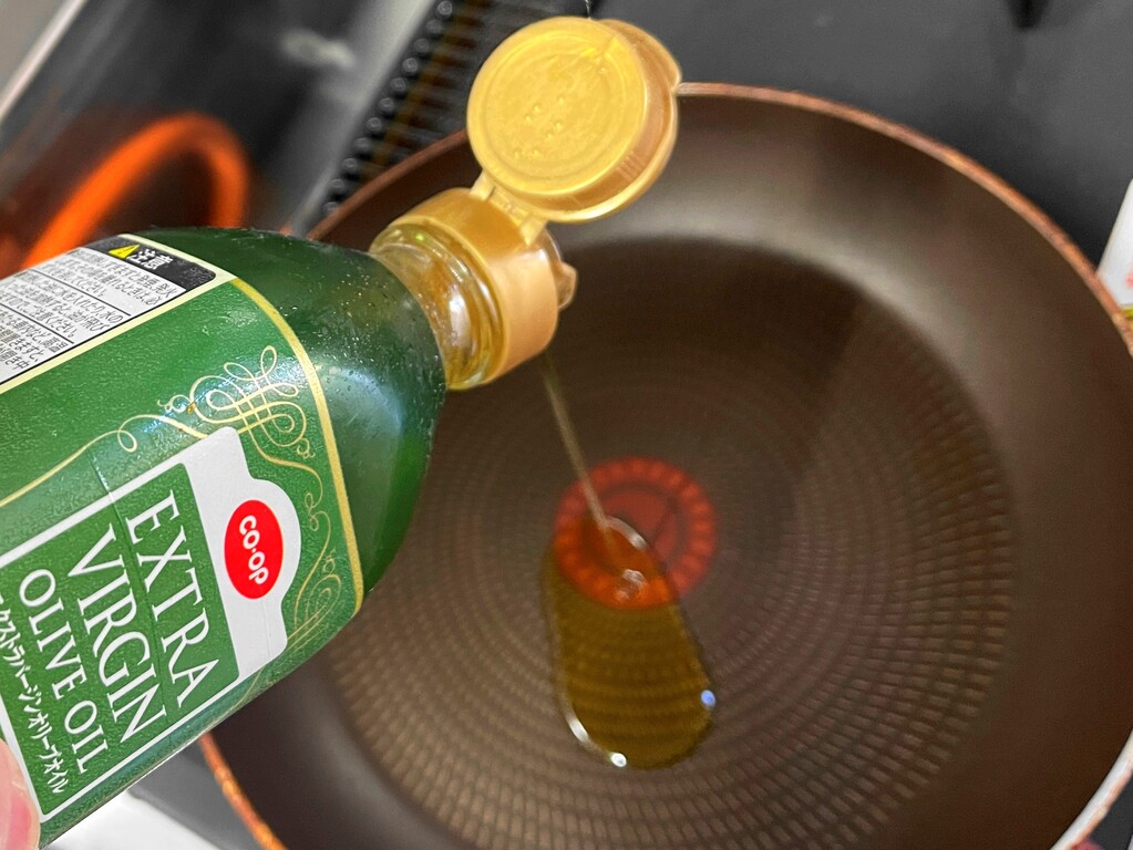 続いてはフライパンにオリーブオイルを薄く引いて・・・