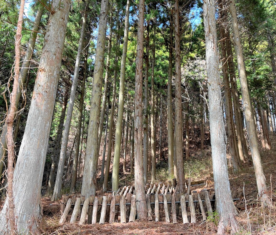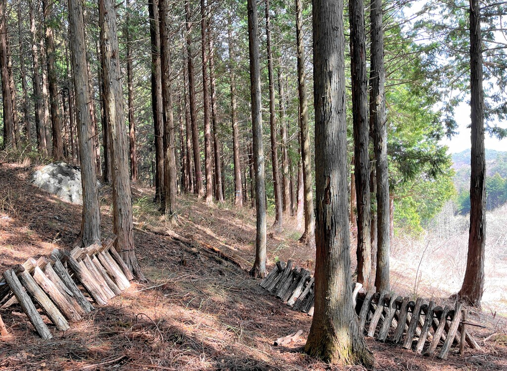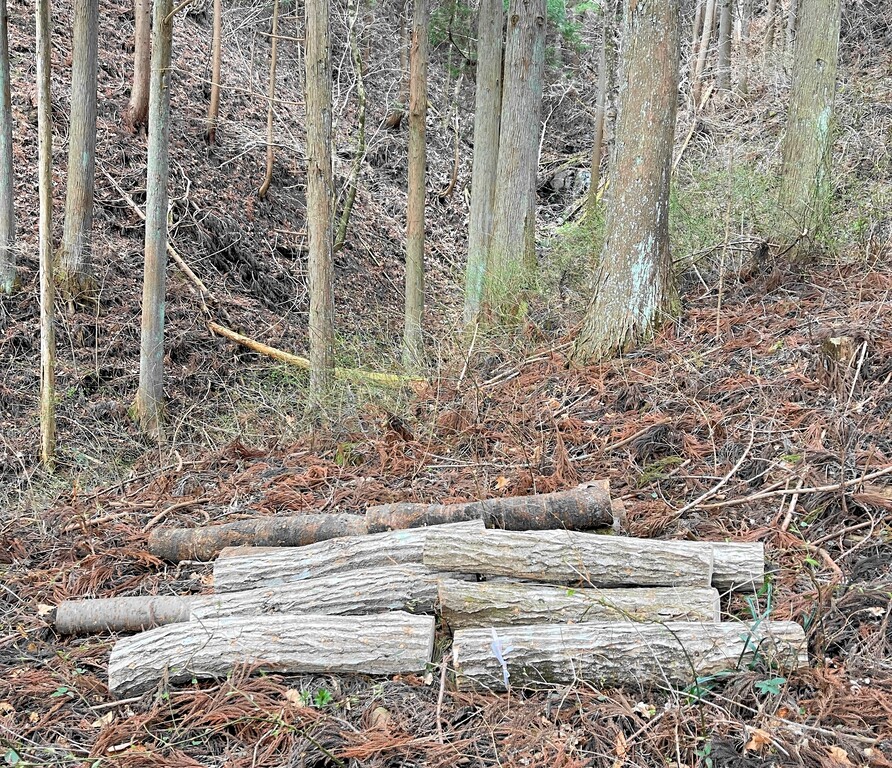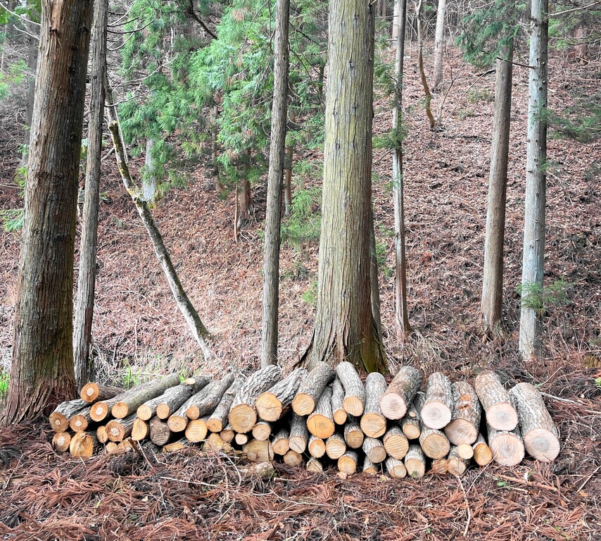 「ほだぎ」は、とりあえず一旦こんな感じに山に置いておきます。「ほだぎ」を置く場所は日当たりが良すぎても悪すぎてもダメらしいです。今回は杉林の中に置きました。