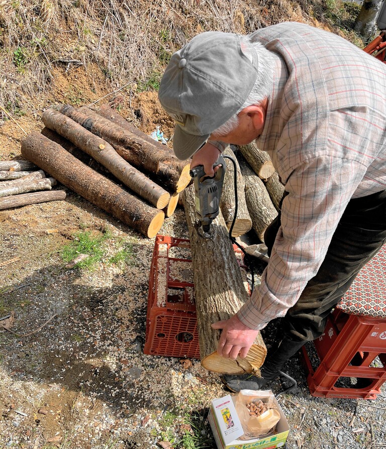 まず、原木にドリルで穴を開けます。原木の太さにもよりますが、1本に約20~40個の穴を開けます。