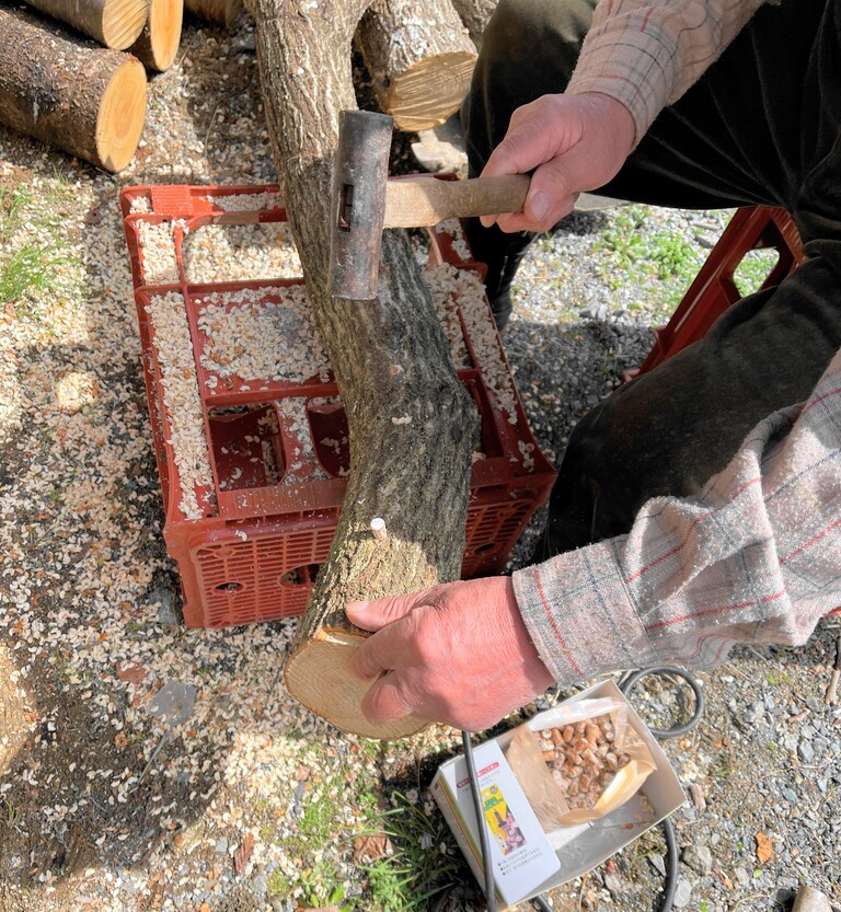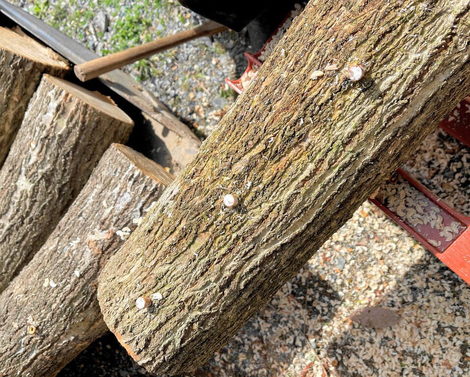 こうして種駒を打ち込んだ原木を「ほだぎ(榾木))」と呼びます。