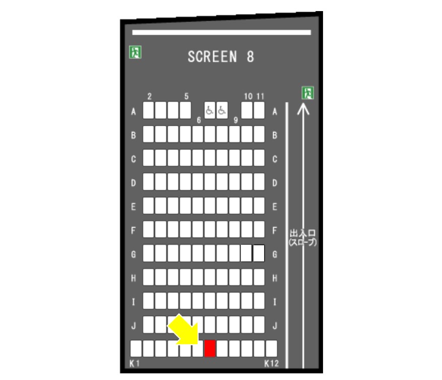 私が映画館で座る席は、いつも一番後ろと決めているのですが、今日もこちらの席を確保しました。