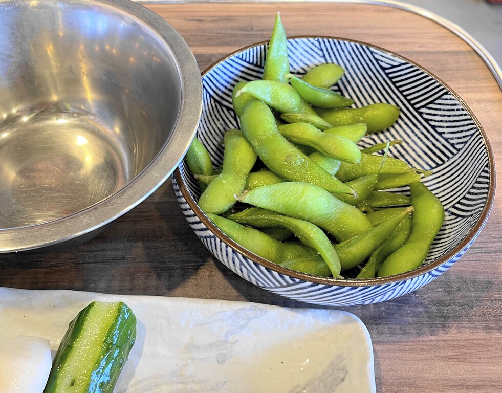 無料の「焼き鳥5本盛」がくるまで、お新香と枝豆でつなぎます(笑)
