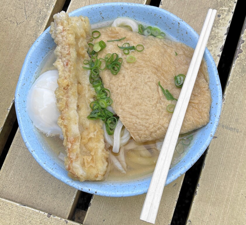 こちらが私がオーダー「うどん大(2玉)、温泉卵、あげ、ちくわ天」です。合計で640円でした。