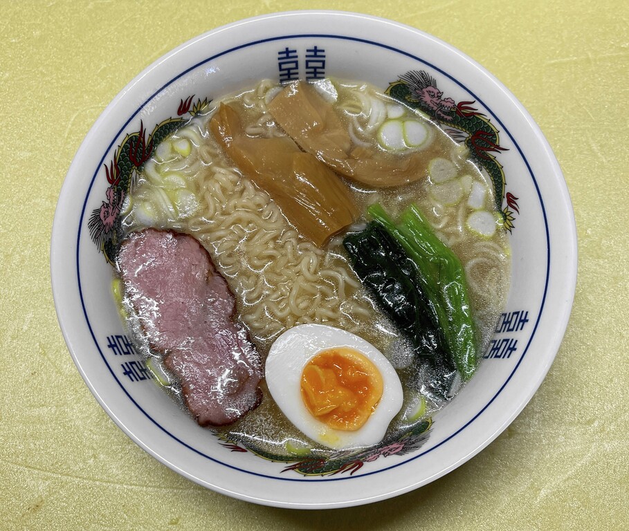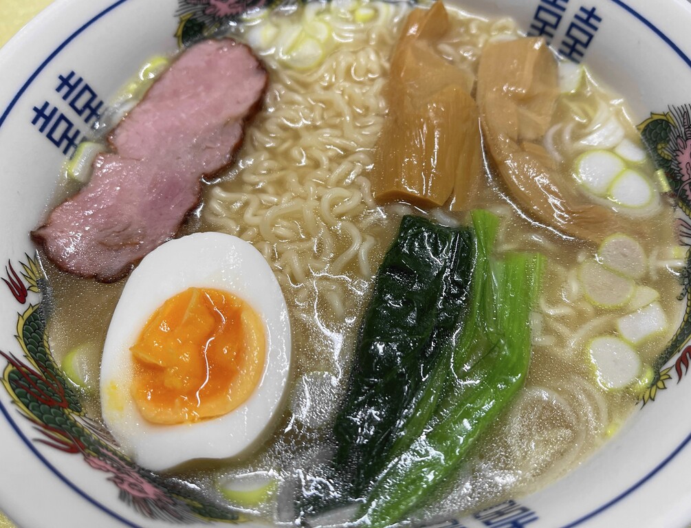 トッピングは、ネギ、メンマ、チャーシュー、煮玉子、そして小松菜です。