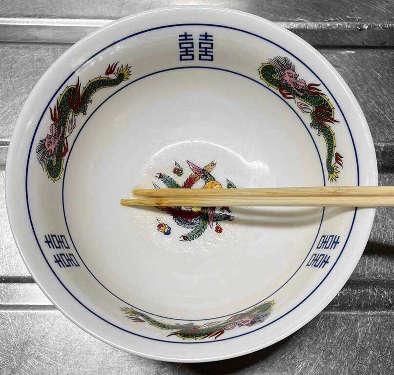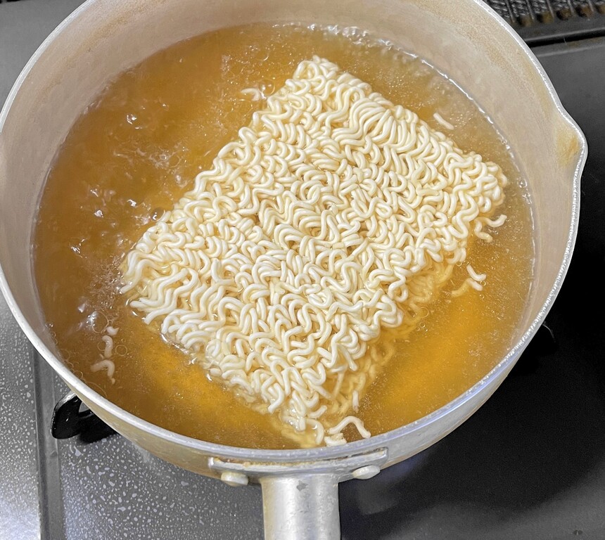 この商品は、お湯を沸騰させたらまず液体スープを入れます。そしてそのスープで乾麺を3分間茹でるという作り方でした。これを読まなかったら、液体スープは最後に入れていたことでしょう。慣れたインスタント袋麺とはいえ、やはり作り方はしっかり読まなければなりませんね(笑)