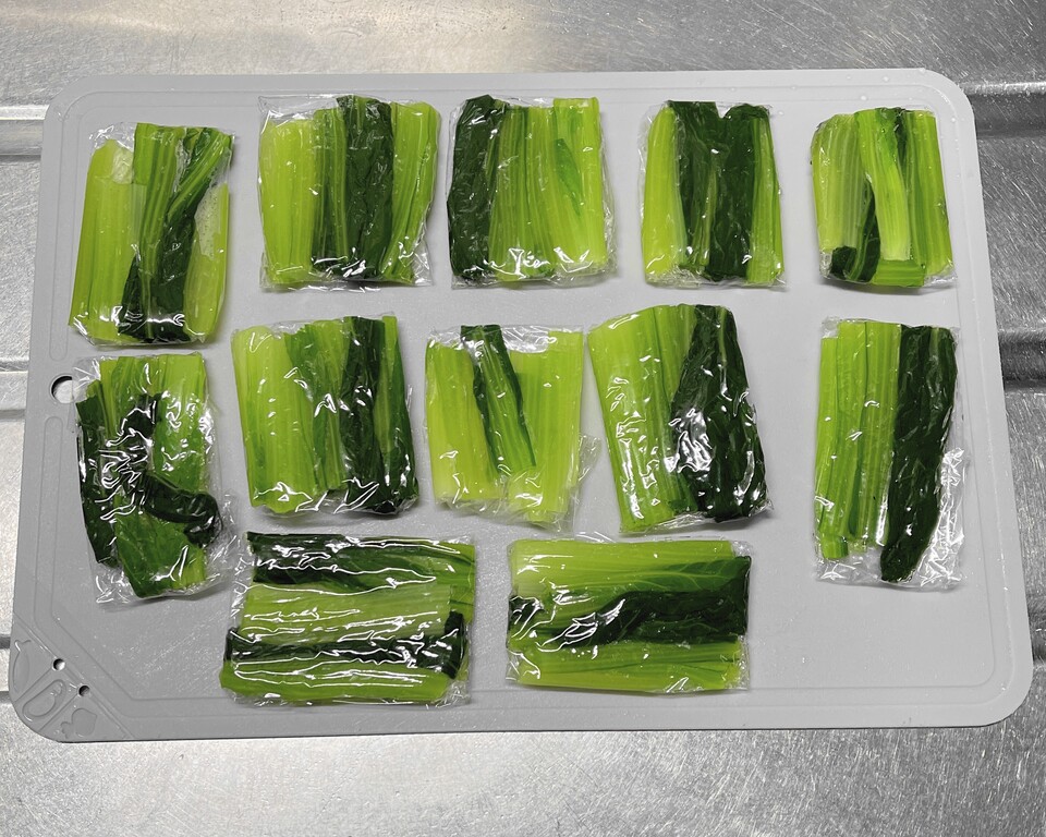 水洗いして、よ~く絞り、適当な長さにカットしてラップで包みます。