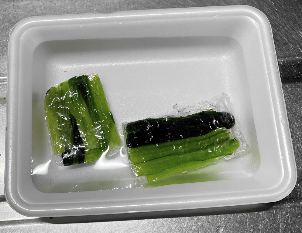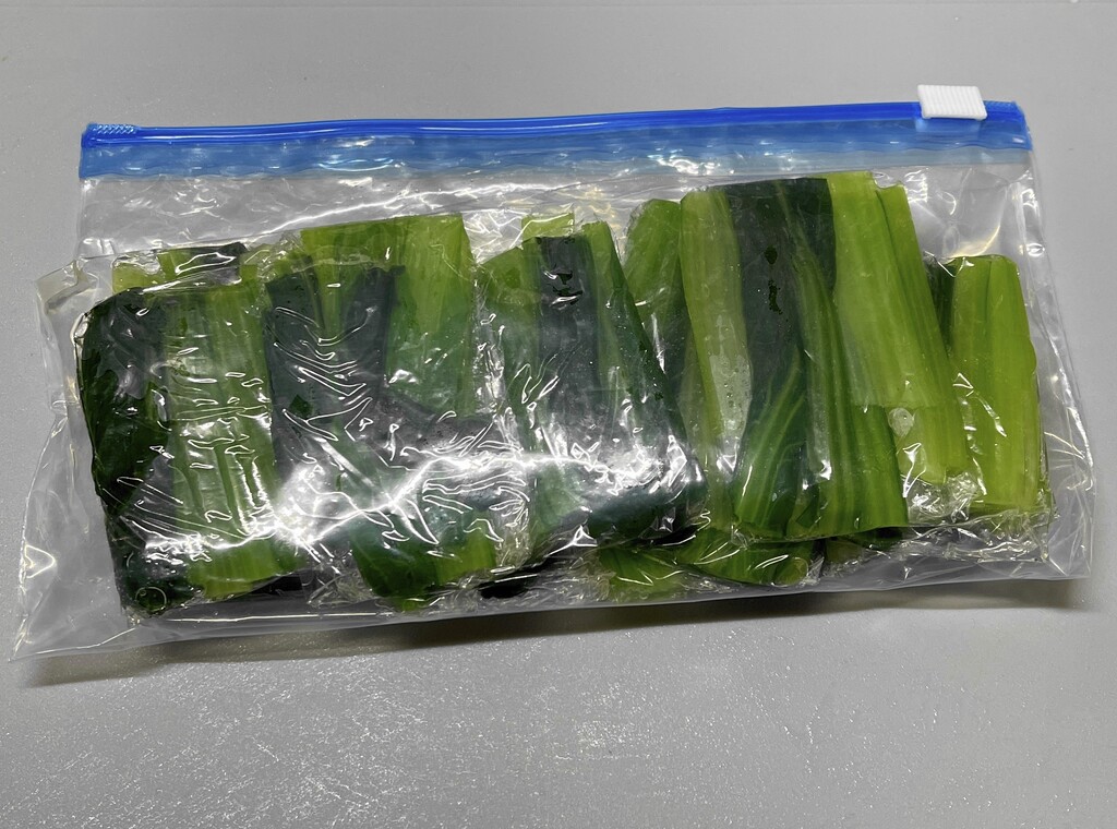 今回のラーメンのトッピングに使った「小松菜」ですが、ヒマな時に茹でて冷凍保存しておいたものを使いました。