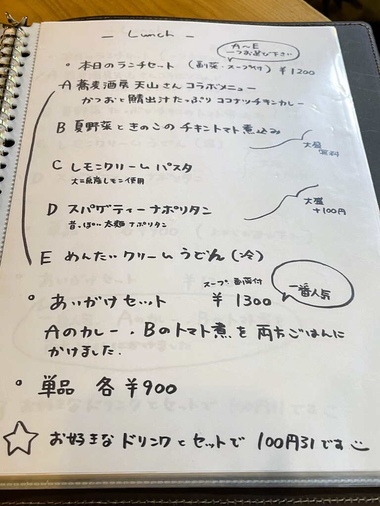 そういう時は「おすすめメニュー」をいただくのが無難かなと思い、一番人気という「あいがけセット(1,300円)」にしてみました。「かつおと鯖出汁たっぷりココナッツチキンカレー」と「夏野菜ときのこのチキントマト煮込み」の両方が楽しめるみたいです。それとドリンクをセットにすると100円引きとなるとのことなので「平伏沼(へぶすぬま)メロンソーダ(450円)」なるものもお願いしました。