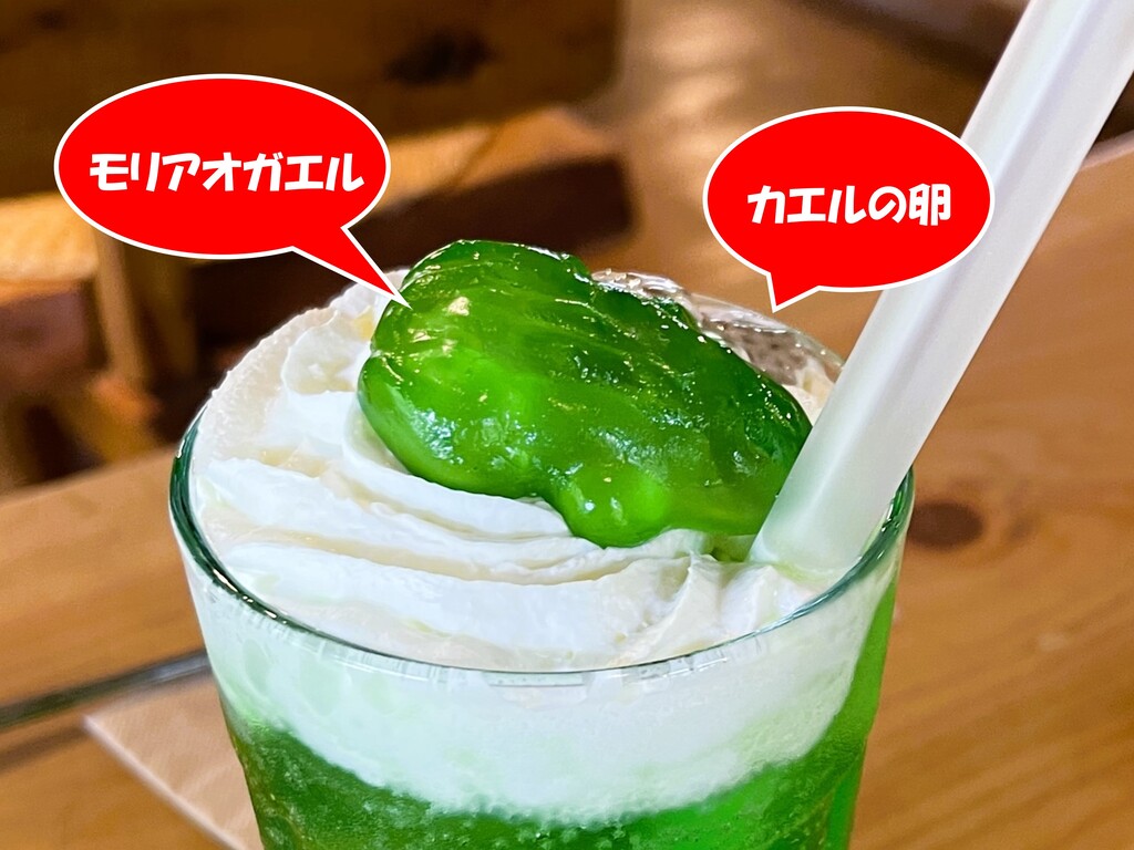 どうやら「緑」のゼリーみたいなものが「モリアオガエル」で、なんか種の入った果物みたいなヤツを「モリアオガエルの卵」に見立てているらしいのですが・・・。