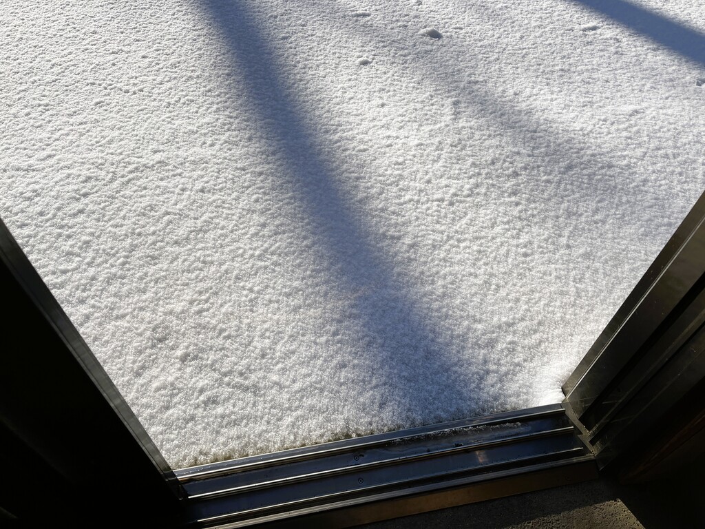 2cmくらいの積雪でした。風が強かったらしく、軒下まで雪がふっかけてました。