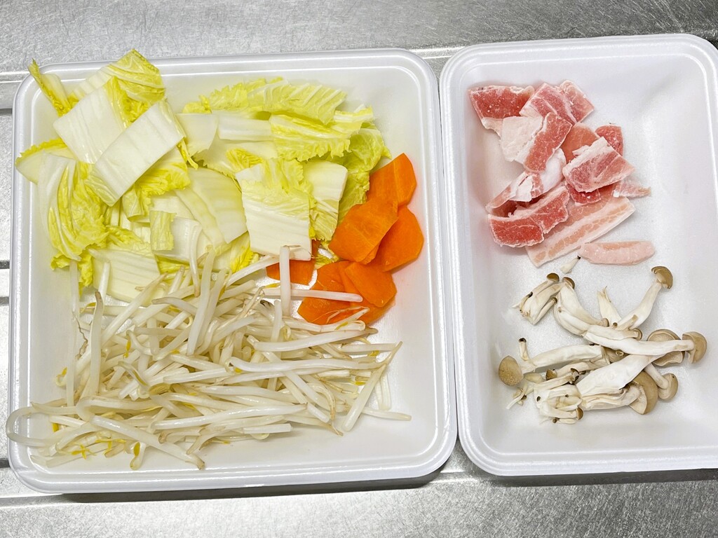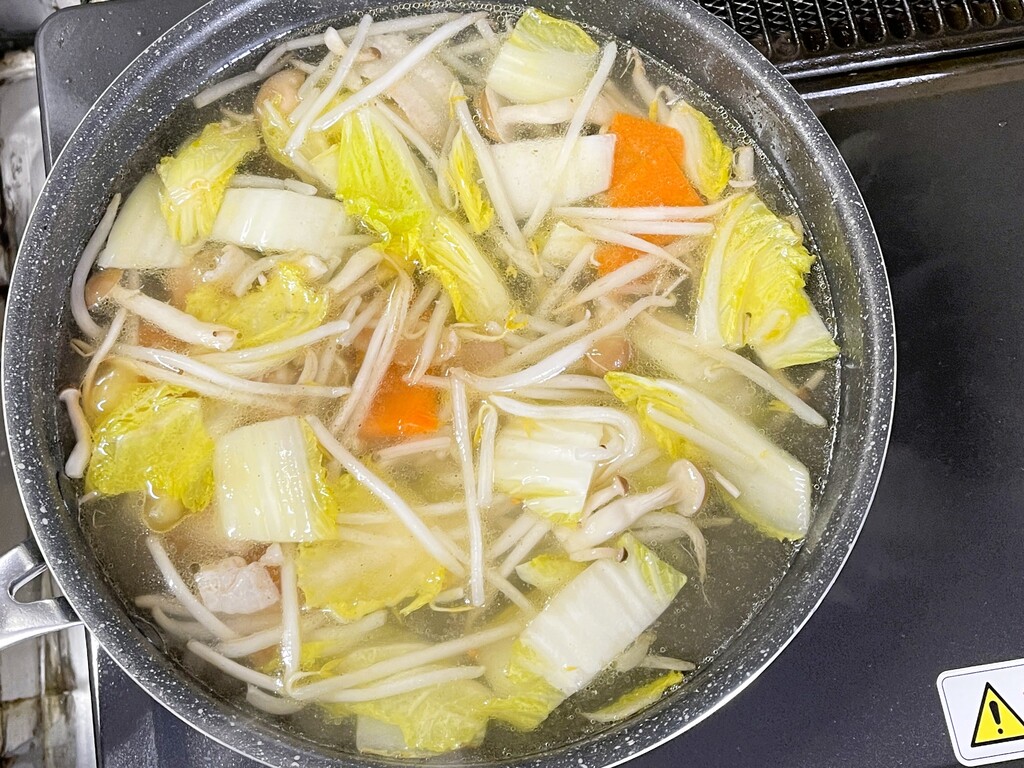 白菜、ニンジン、もやし、ブナシメジ、豚バラ肉。全て冷蔵庫の残り物です(笑)