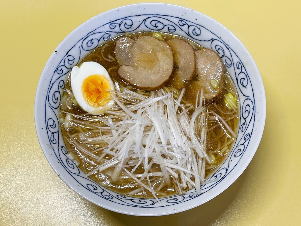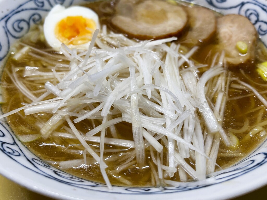 トッピングは煮卵とチャーシュー、そして白髪ネギをたっぷりと載せてみました。