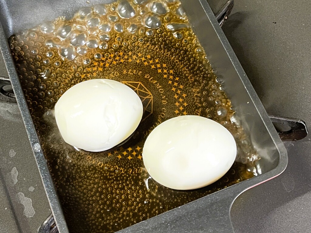 いつもの煮卵は、ゆで卵を麺つゆなどに1日以上浸け置きして作っているのですが、今回は時間が無かったのでこんなことをやってみました。