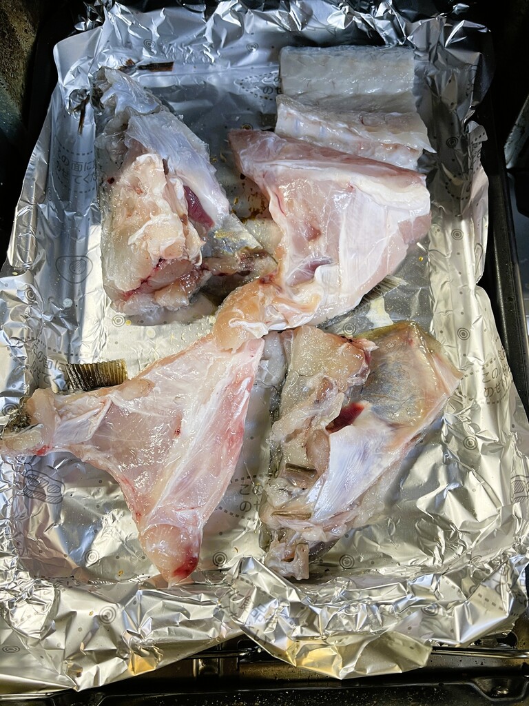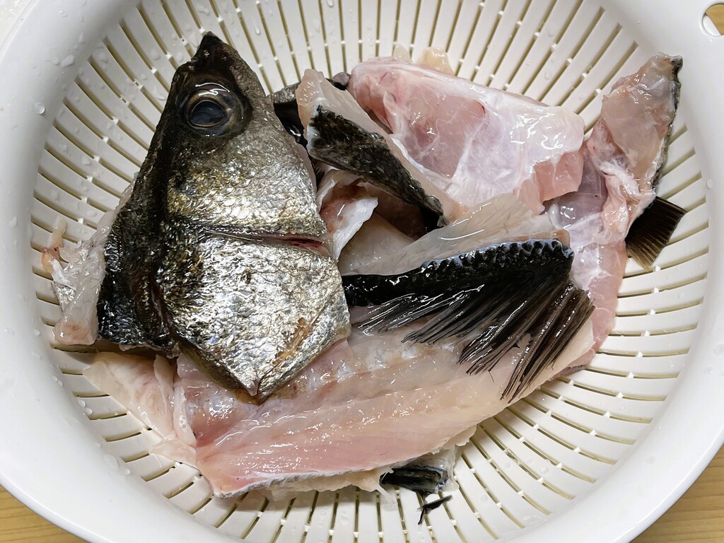 スズキのアラは、さすがに七度は洗いませんでしたが、きれいにするため丁寧にしっかりと水洗いをしました。